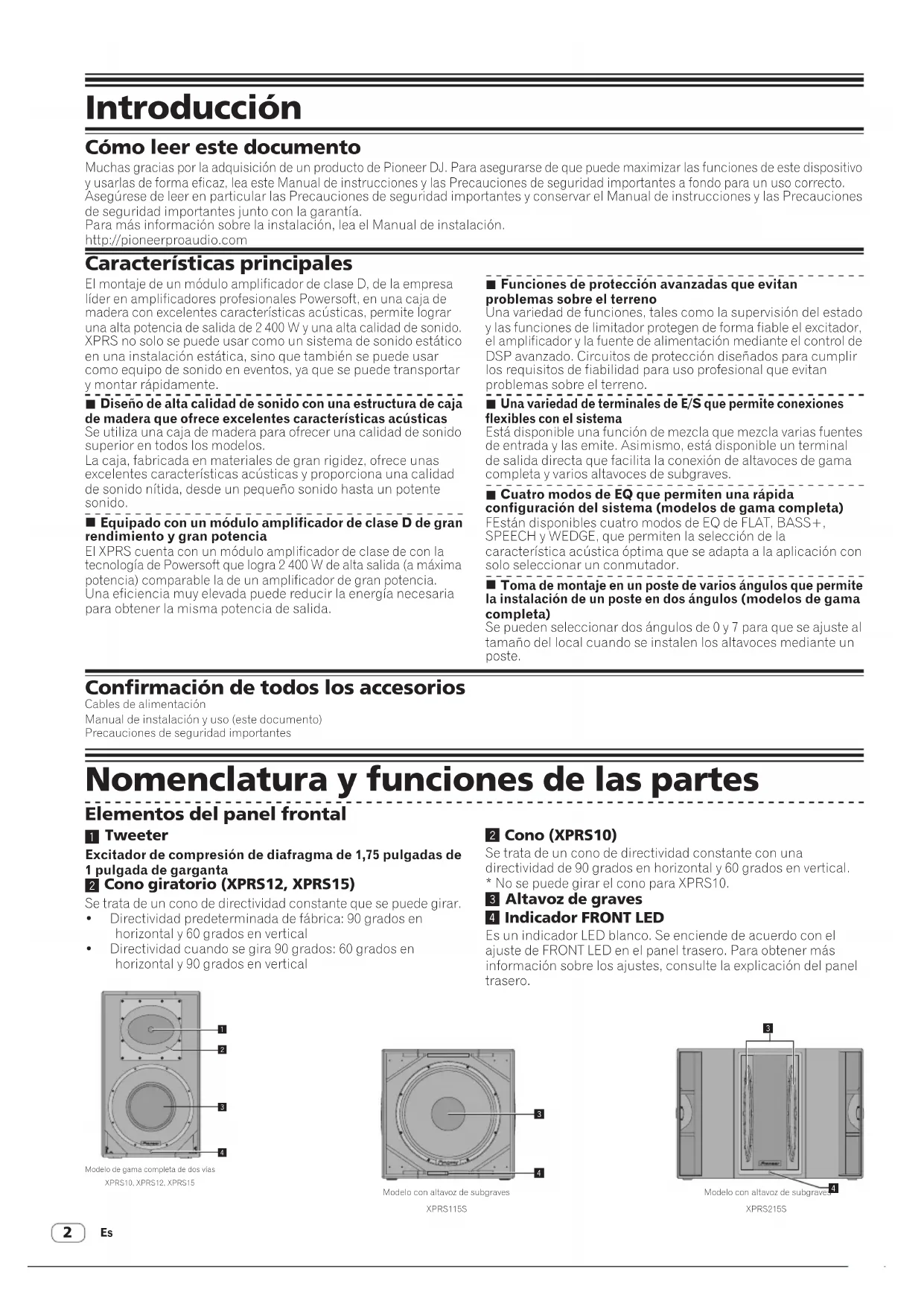 Introducción Cómo leer este documento Muchas gracias por la adquisición de un producto de Pioneer DJ. Para asegurarse de que puede maximizar las funciones de este dispositivo y usarlas de forma eficaz, lea este Manual de instrucciones y las Precauciones de seguridad importantes a fondo para un uso correcto. Asegúrese de leer en particular las Precauciones de seguridad importantes y conservar el Manual de instrucciones y las Precauciones de seguridad importantes junto con la garantía. Para más información sobre la instalación, lea el Manual de instalación. http://pioneerproaudio.com El montaje de un módulo amplificador de clase D, de la empresa líder en amplificadores profesionales Powersoft, en una caja de madera con excelentes características acústicas, permite lograr una alta potencia de salida de 2 400 W y una alta calidad de sonido. XPRS no solo se puede usar como un sistema de sonido estático en una instalación estática, sino que también se puede usar como equipo de sonido en eventos, ya que se puede transportar y montar rápidamente.