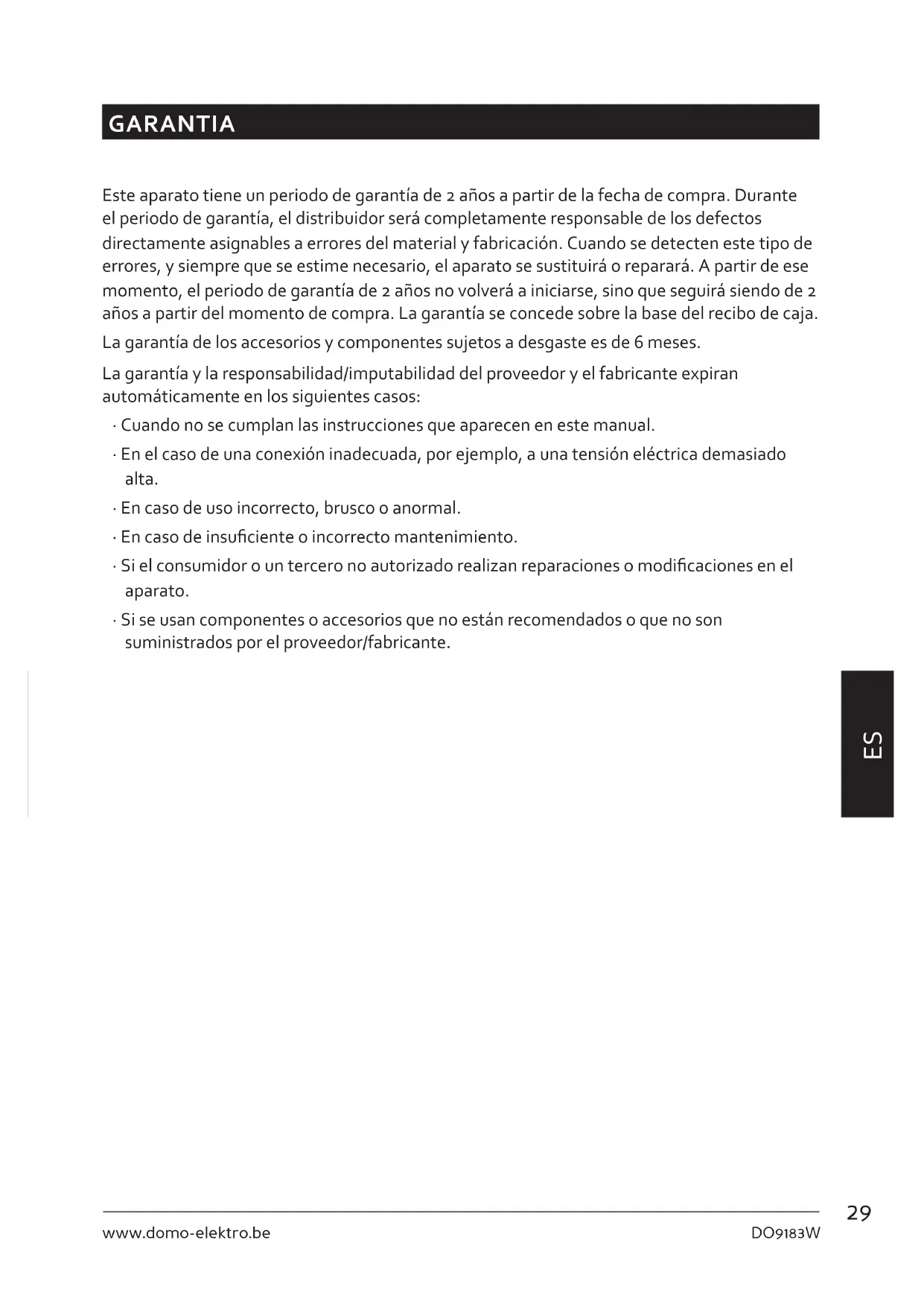 GARANTIA Este aparato tiene un periodo de garantía de 2 años a partir de la fecha de compra. Durante el periodo de garantía, el distribuidor será completamente responsable de los defectos directamente asignables a errores del material y fabricación. Cuando se detecten este tipo de errores, y siempre que se estime necesario, el aparato se sustituirá o reparará. A partir de ese momento, el periodo de garantía de 2 años no volverá a iniciarse, sino que seguirá siendo de 2 años a partir del momento de compra. La garantía se concede sobre la base del recibo de caja. La garantía de los accesorios y componentes sujetos a desgaste es de 6 meses. La garantía y la responsabilidad/imputabilidad del proveedor y el fabricante expiran automáticamente en los siguientes casos: