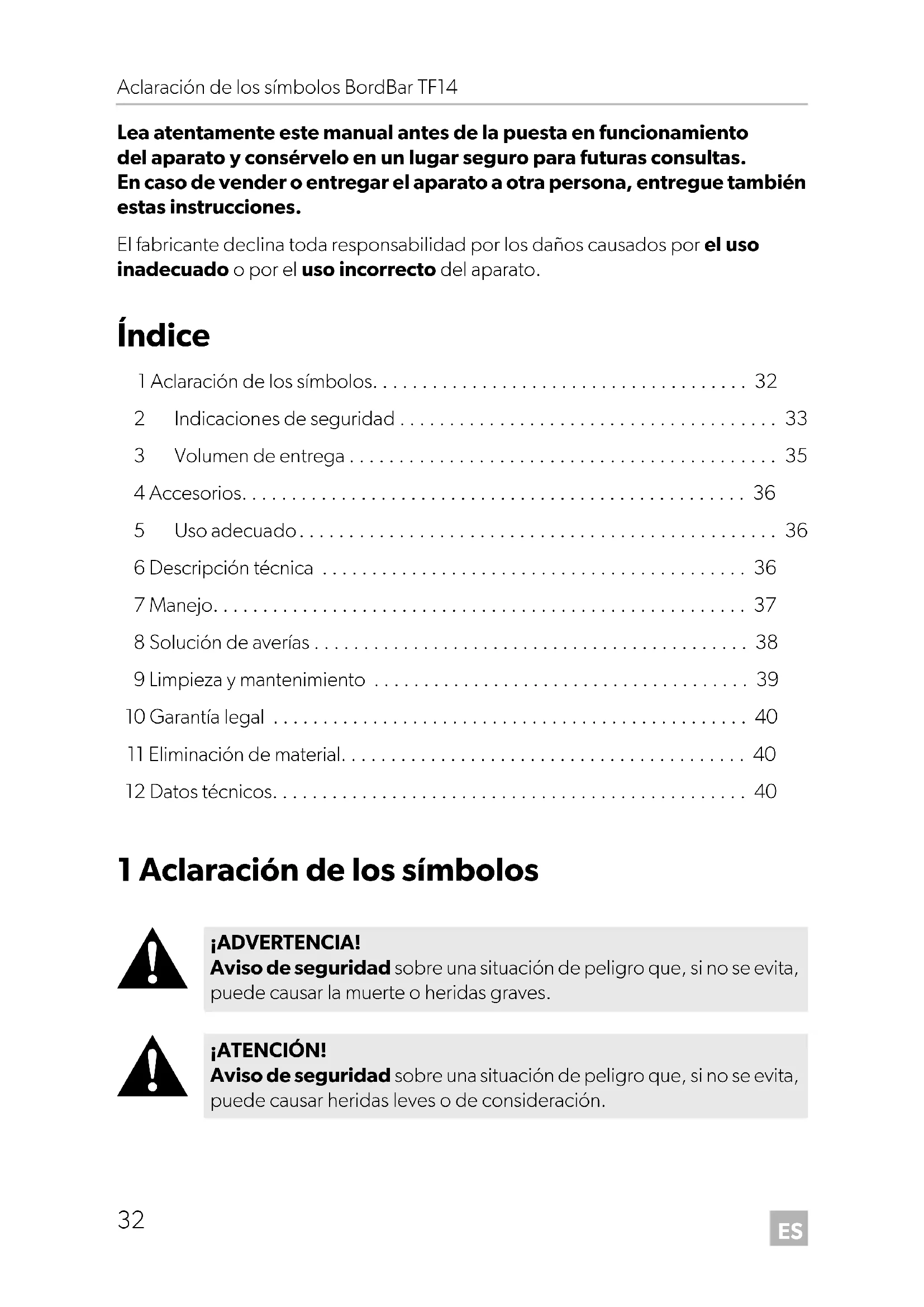- Lea atentamente este manual antes de la puesta en funcionamiento del aparato y consérvelo en un lugar seguro para futuras consultas. En caso de vender o entregar el aparato a otra persona, entregue también estas instrucciones. El fabricante declina toda responsabilidad por los daños causados por el uso inadecuado o por el uso incorrecto del aparato. Índice 1 Aclaración de los símbolos p. 32