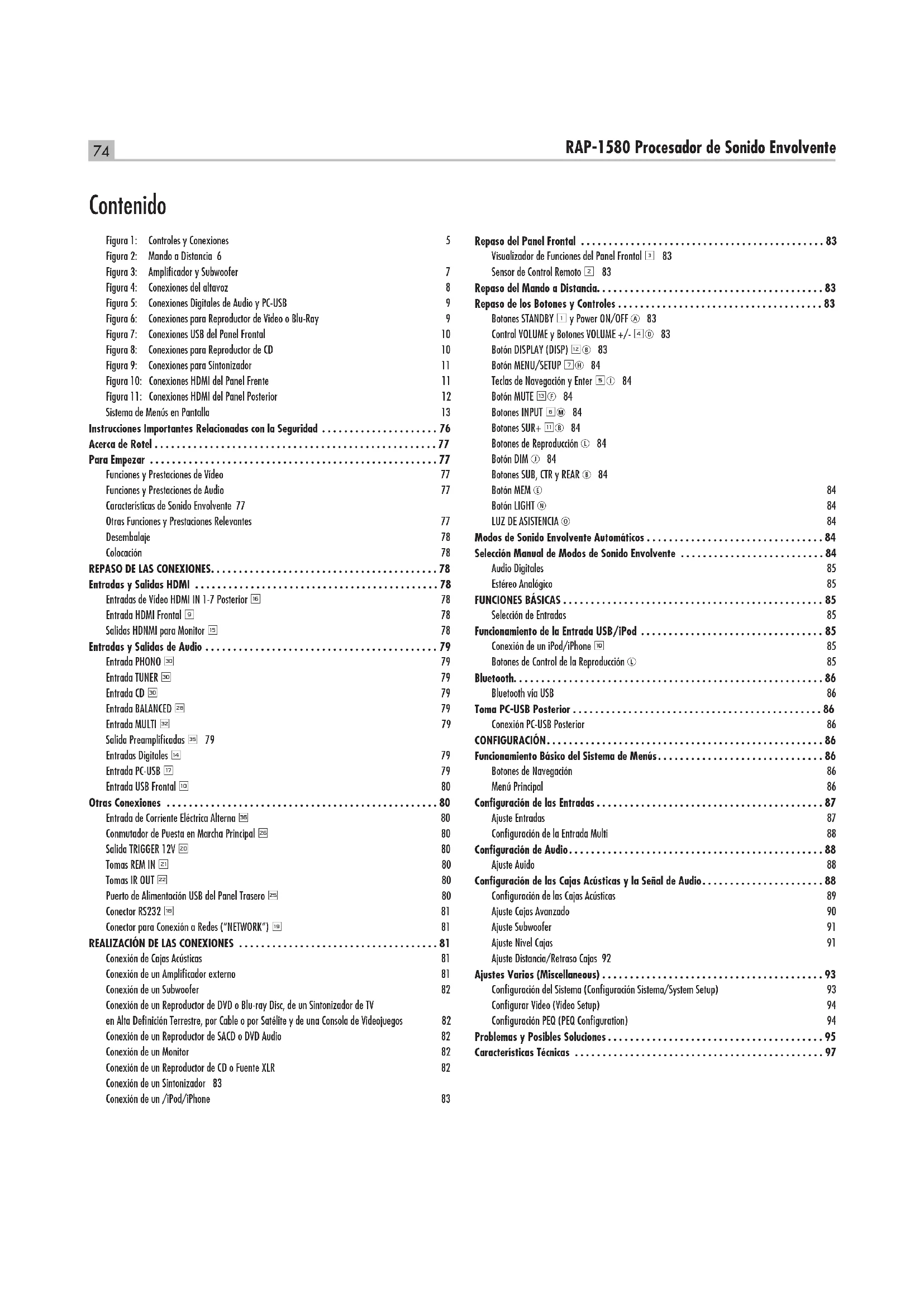 - Contenido Figura 1: Controles y Conexiones 5 Figura 2: Mando a Distancia 6 Figura 3: Amplicador y Subwoofer 7 Figura 4: Conexiones del altavoz 8 Figura 5: Conexiones Digitales de Audio y PC-USB 9 Figura 6: Conexiones para Reproductor de Video o Blu-Ray 9 Figura 7: Conexiones USB del Panel Frontal 10 Figura 8: Conexiones para Reproductor de CD 10 Figura 9: Conexiones para Sintonizador 11 Figura 10: Conexiones HDMI del Panel Frente 11 Figura 11: Conexiones HDMI del Panel Posterior 12 Sistema de Menús en Pantalla 13 Instrucciones Importantes Relacionadas con la Seguridad p. 76