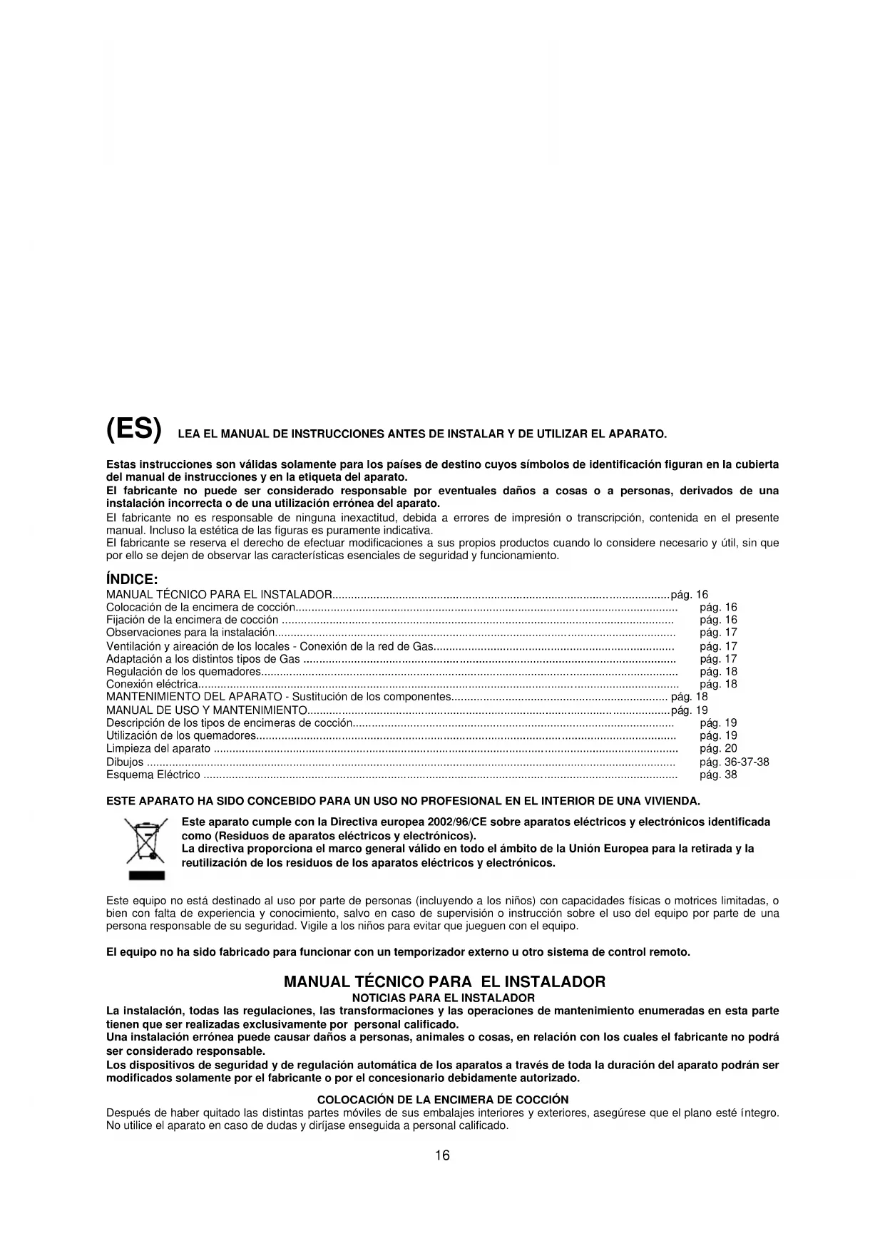 (ES) LEA EL MANUAL DE INSTRUCCIONES ANTES DE INSTALAR Y DE UTILIZAR EL APARATO. Estas instrucciones son válidas solamente para los países de destino cuyos símbolos de identificación figuran en la cubierta del manual de instrucciones y en la etiqueta del aparato. El fabricante no puede ser considerado responsable por eventuales daños a cosas o a personas, derivados de una instalación incorrecta o de una utilización errónea del aparato. El fabricante no es responsable de ninguna inexactitud, debida a errores de impresión o transcripción, contenida en el presente manual. Incluso la estética de las figuras es puramente indicativa. El fabricante se reserva el derecho de efectuar modificaciones a sus propios productos cuando lo considere necesario y útil, sin que por ello se dejen de observar las características esenciales de seguridad y funcionamiento. ÍNDICE: MANUAL TÉCNICO PARA EL INSTALADOR.......................................................................................................... pág. 16 Colocación de la encimera de cocción........................................................................................................................ pág. 16 Fijación de la encimera de cocción ........................................................................................................................... pág. 16 Observaciones para la instalación.............................................................................................................................. pág. 17 Ventilación y aireación de los locales - Conexión de la red de Gas............................................................................ pág. 17 Adaptación a los distintos tipos de Gas ..................................................................................................................... pág. 17 Regulación de los quemadores................................................................................................................................... pág. 18 Conexión eléctrica....................................................................................................................................................... pág. 18 MANTENIMIENTO DEL APARATO - Sustitución de los componentes.................................................................... pág. 18 MANUAL DE USO Y MANTENIMIENTO.................................................................................................................. pág. 19 Descripción de los tipos de encimeras de cocción..................................................................................................... pág. 19 Utilización de los quemadores.................................................................................................................................... pág. 19 Limpieza del aparato .................................................................................................................................................. pág. 20 Dibujos ...................................................................................................................................................................... pág. 36-37-38 Esquema Eléctrico ..................................................................................................................................................... pág. 38 ESTE APARATO HA SIDO CONCEBIDO PARA UN USO NO PROFESIONAL EN EL INTERIOR DE UNA VIVIENDA. Este aparato cumple con la Directiva europea 2002/96/CE sobre aparatos eléctricos y electrónicos identificada como (Residuos de aparatos eléctricos y electrónicos). La directiva proporciona el marco general válido en todo el ámbito de la Unión Europea para la retirada y la reutilización de los residuos de los aparatos eléctricos y electrónicos.