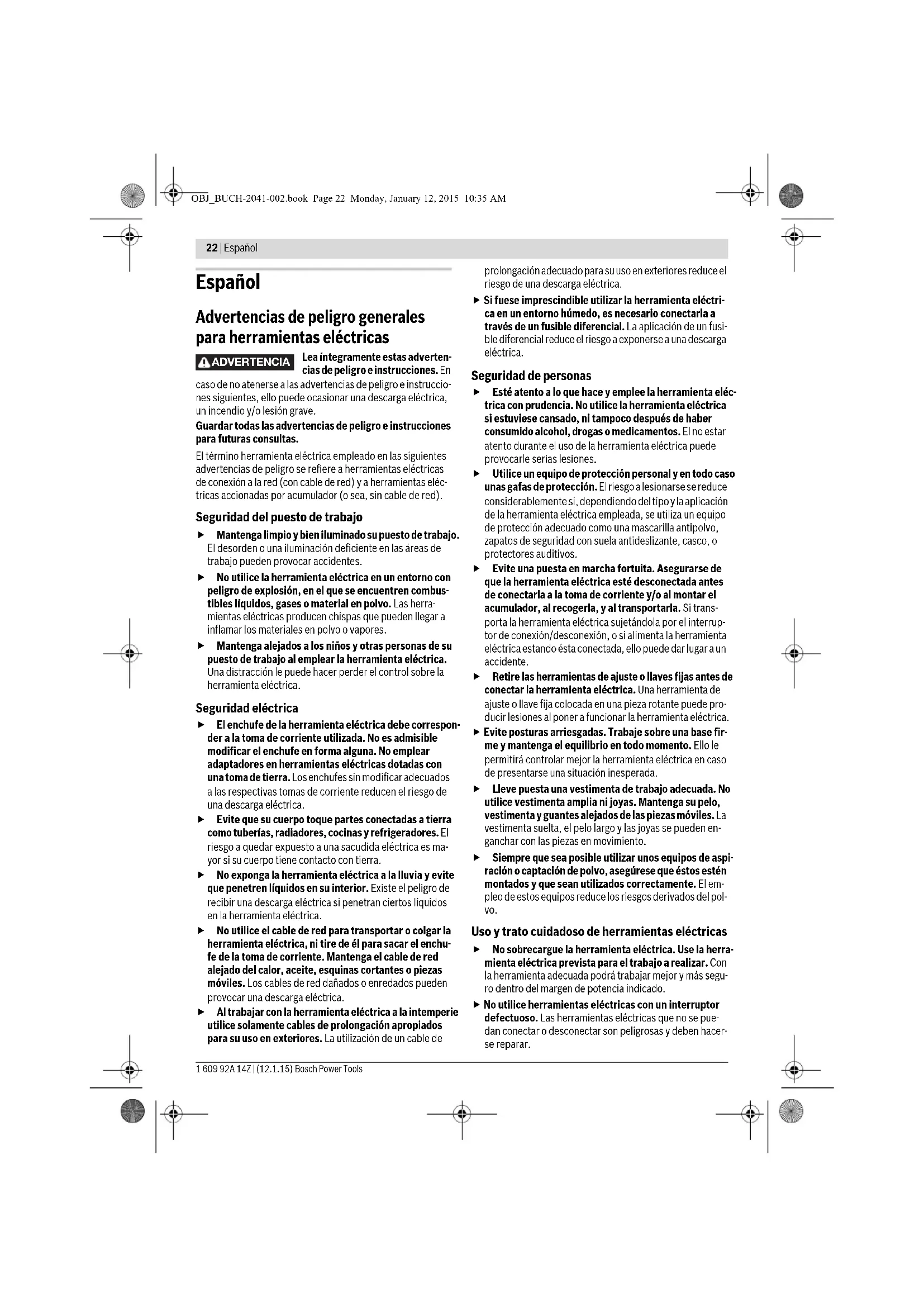 Montage/démontage du clip de couleur 12 209 Montage/démontage du porte-embout 13 209 Sélection mécanique de la vitesse 14 209 Opération Figure Respectez Page OBJ_BUCH-2041-002.book Page 20 Monday, January 12, 2015 10:35 AMFrançais | 21 Bosch Power Tools 1 609 92A 14Z | (12.1.15) Nettoyage et entretien Veillez à ce que l’outil électroportatif ainsi que les ouïes de ventilation soient toujours propres afin d’obtenir un travail impeccable et sûr. Après chaque utilisation, nettoyez l’outil de travail, le porte- outil et les ouïes de ventilation de l’outil électroportatif ainsi que les ouïes de ventilation de l’accumulateur. Service Après-Vente et Assistance Notre Service Après-Vente répond à vos questions concer- nant la réparation et l’entretien de votre produit et les pièces de rechange. Vous trouverez des vues éclatées ainsi que des informations concernant les pièces de rechange également sous : www.bosch-pt.com Les conseillers techniques et assistants Bosch sont à votre disposition pour répondre à vos questions concernant nos produits et leurs accessoires. Pour toute demande de renseignement ou commande de pièces de rechange, précisez-nous impérativement le numéro d’article à dix chiffres de l’outil électroportatif indiqué sur la plaque signalétique. France Passez votre commande de pièces détachées directement en ligne sur notre site www.bosch-pt.fr. Vous êtes un utilisateur, contactez : Le Service Clientèle Bosch Outillage Electroportatif Tel. : 0811 360122 (coût d’une communication locale) Fax : (01) 49454767 E-Mail : contact.outillage-electroportatif@fr.bosch.com Vous êtes un revendeur, contactez : Robert Bosch (France) S.A.S. Service Après-Vente Electroportatif 126, rue de Stalingrad 93705 DRANCY Cédex Tel. : (01) 43119006 Fax : (01) 43119033 E-Mail : sav.outillage-electroportatif@fr.bosch.com Belgique, Luxembourg Tel. : +32 2 588 0589 Fax : +32 2 588 0595 E-Mail : outillage.gereedschap@be.bosch.com Suisse Passez votre commande de pièces détachées directement en ligne sur notre site www.bosch-pt.com/ch/fr. Tel. : (044) 8471512 Fax : (044) 8471552 E-Mail : Aftersales.Service@de.bosch.com Transport Les batteries Lithium-ion sont soumises aux règlements de transport des matières dangereuses. L’utilisateur peut trans- porter les batteries par voie routière sans mesures supplé- mentaires. Lors d’une expédition par tiers (par ex. : transport aérien ou entreprise de transport), les mesures à prendre spécifiques à l’emballage et au marquage doivent être observées. Dans un tel cas, lors de la préparation de l’envoi, il est impératif de faire appel à un expert en transport des matières dange- reuses. N’expédiez les accus que si le carter n’est pas endommagé. Recouvrez les contacts non protégés et emballez l’accu de manière à ce qu’il ne puisse pas se déplacer dans l’emballage. Veuillez également respecter les règlementations supplémen- taires éventuellement en vigueur. Élimination des déchets Les outils électroportatifs et les accus, ainsi que leurs accessoires et emballages, doivent pouvoir suivre chacun une voie de recyclage appropriée. Ne jetez pas les outils électroportatifs et les accus/piles avec les ordures ménagères ! Seulement pour les pays de l’Union Européenne : Conformément à la directive européenne 2012/19/UE, les équipements électriques dont on ne peut plus se servir, et conformé- ment à la directive européenne 2006/66/CE, les accus/piles usés ou défec- tueux doivent être isolés et suivre une voie de recyclage appropriée. Les batteries/piles dont on ne peut plus se servir peuvent être déposées directement auprès de : Suisse Batrec AG 3752 Wimmis BE Sous réserve de modifications. Mise en marche/arrêt 15 210 Contrôler l’état de charge de l’accu 16 210 Sélection des accessoires – 211 – 212 Opération Figure Respectez Page OBJ_BUCH-2041-002.book Page 21 Monday, January 12, 2015 10:35 AM22 | Español 1 609 92A 14Z | (12.1.15) Bosch Power Tools Español Advertencias de peligro generales para herramientas eléctricas Lea íntegramente estas adverten- cias de peligro e instrucciones. En caso de no atenerse a las advertencias de peligro e instruccio- nes siguientes, ello puede ocasionar una descarga eléctrica, un incendio y/o lesión grave. Guardar todas las advertencias de peligro e instrucciones para futuras consultas. El término herramienta eléctrica empleado en las siguientes advertencias de peligro se refiere a herramientas eléctricas de conexión a la red (con cable de red) y a herramientas eléc- tricas accionadas por acumulador (o sea, sin cable de red). Seguridad del puesto de trabajo Mantenga limpio y bien iluminado su puesto de trabajo. El desorden o una iluminación deficiente en las áreas de trabajo pueden provocar accidentes. No utilice la herramienta eléctrica en un entorno con peligro de explosión, en el que se encuentren combus- tibles líquidos, gases o material en polvo. Las herra- mientas eléctricas producen chispas que pueden llegar a inflamar los materiales en polvo o vapores. Mantenga alejados a los niños y otras personas de su puesto de trabajo al emplear la herramienta eléctrica. Una distracción le puede hacer perder el control sobre la herramienta eléctrica. Seguridad eléctrica El enchufe de la herramienta eléctrica debe correspon- der a la toma de corriente utilizada. No es admisible modificar el enchufe en forma alguna. No emplear adaptadores en herramientas eléctricas dotadas con una toma de tierra. Los enchufes sin modificar adecuados a las respectivas tomas de corriente reducen el riesgo de una descarga eléctrica. Evite que su cuerpo toque partes conectadas a tierra como tuberías, radiadores, cocinas y refrigeradores. El riesgo a quedar expuesto a una sacudida eléctrica es ma- yor si su cuerpo tiene contacto con tierra. No exponga la herramienta eléctrica a la lluvia y evite que penetren líqu