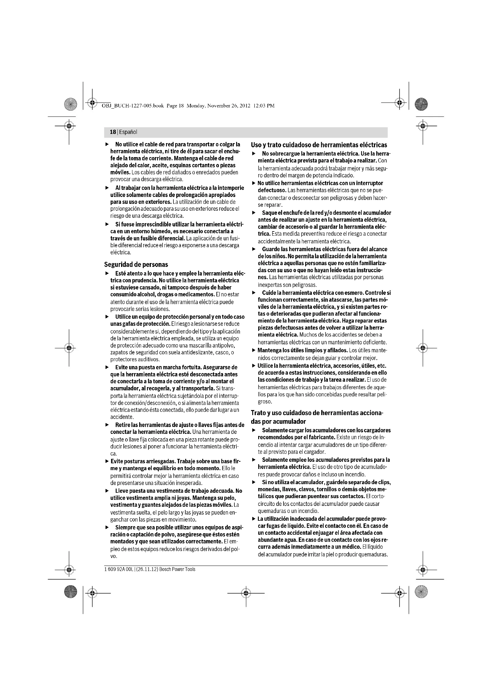 Sélection des accessoires – 147 OBJ_BUCH-1227-005.book Page 16 Monday, November 26, 2012 12:03 PMEspañol | 17 Bosch Power Tools 1 609 92A 00L | (26.11.12) France Vous êtes un utilisateur, contactez : Le Service Clientèle Bosch Outillage Electroportatif Tel. : 0811 360122 (coût d’une communication locale) Fax : (01) 49454767 E-Mail : contact.outillage-electroportatif@fr.bosch.com Vous êtes un revendeur, contactez : Robert Bosch (France) S.A.S. Service Après-Vente Electroportatif 126, rue de Stalingrad 93705 DRANCY Cédex Tel. : (01) 43119006 Fax : (01) 43119033 E-Mail : sav.outillage-electroportatif@fr.bosch.com Belgique, Luxembourg Tel. : +32 2 588 0589 Fax : +32 2 588 0595 E-Mail : outillage.gereedschap@be.bosch.com Suisse Tel. : (044) 8471512 Fax : (044) 8471552 E-Mail: Aftersales.Service@de.bosch.com Transport Les batteries Lithium-ion sont soumises aux règlements de transport des matières dangereuses. L’utilisateur peut trans- porter les batteries par voie routière sans mesures supplé- mentaires. Lors d’une expédition par tiers (par ex. : transport aérien ou entreprise de transport), les mesures à prendre spécifiques à l’emballage et au marquage doivent être observées. Dans un tel cas, lors de la préparation de l’envoi, il est impératif de faire appel à un expert en transport des matières dangereuses. N’expédiez les accus que si le carter n’est pas endommagé. Recouvrez les contacts non protégés et emballez l’accu de manière à ce qu’il ne puisse pas se déplacer dans l’emballage. Veuillez également respecter les règlementations supplémen- taires éventuellement en vigueur. Elimination des déchets Les outils électroportatifs et les accus, ainsi que leurs accessoires et emballages, doivent pouvoir suivre chacun une voie de recyclage appropriée. Ne jetez pas les outils électroportatifs et les accus/piles avec les ordures ménagères ! Seulement pour les pays de l’Union Européenne : Conformément à la directive européenne 2002/96/CE, les équipements électriques dont on ne peut plus se servir, et conformé- ment à la directive européenne 2006/66/CE, les accus/piles usés ou dé- fectueux doivent être isolés et suivre une voie de recyclage appropriée. Les batteries/piles dont on ne peut plus se servir peuvent être déposées directement auprès de : Suisse Batrec AG 3752 Wimmis BE Sous réserve de modifications. Español Advertencias de peligro generales para herramientas eléctricas Lea íntegramente estas adverten- cias de peligro e instrucciones. En caso de no atenerse a las advertencias de peligro e instruccio- nes siguientes, ello puede ocasionar una descarga eléctrica, un incendio y/o lesión grave. Guardar todas las advertencias de peligro e instrucciones para futuras consultas. El término herramienta eléctrica empleado en las siguientes advertencias de peligro se refiere a herramientas eléctricas de conexión a la red (con cable de red) y a herramientas eléc- tricas accionadas por acumulador (o sea, sin cable de red). Seguridad del puesto de trabajo Mantenga limpio y bien iluminado su puesto de trabajo. El desorden o una iluminación deficiente en las áreas de trabajo pueden provocar accidentes. No utilice la herramienta eléctrica en un entorno con peligro de explosión, en el que se encuentren combus- tibles líquidos, gases o material en polvo. Las herra- mientas eléctricas producen chispas que pueden llegar a inflamar los materiales en polvo o vapores. Mantenga alejados a los niños y otras personas de su puesto de trabajo al emplear la herramienta eléctrica. Una distracción le puede hacer perder el control sobre la herramienta eléctrica. Seguridad eléctrica El enchufe de la herramienta eléctrica debe correspon- der a la toma de corriente utilizada. No es admisible modificar el enchufe en forma alguna. No emplear adaptadores en herramientas eléctricas dotadas con una toma de tierra. Los enchufes sin modificar adecuados a las respectivas tomas de corriente reducen el riesgo de una descarga eléctrica. Evite que su cuerpo toque partes conectadas a tierra como tuberías, radiadores, cocinas y refrigeradores. El riesgo a quedar expuesto a una sacudida eléctrica es ma- yor si su cuerpo tiene contacto con tierra. No exponga la herramienta eléctrica a la lluvia y evite que penetren líquidos en su interior. Existe el peligro de recibir una descarga eléctrica si penetran ciertos líquidos en la herramienta eléctrica. ADVERTENCIA OBJ_BUCH-1227-005.book Page 17 Monday, November 26, 2012 12:03 PM18 | Español 1 609 92A 00L | (26.11.12) Bosch Power Tools No utilice el cable de red para transportar o colgar la herramienta eléctrica, ni tire de él para sacar el enchu- fe de la toma de corriente. Mantenga el cable de red alejado del calor, aceite, esquinas cortantes o piezas móviles. Los cables de red dañados o enredados pueden provocar una descarga eléctrica. Al trabajar con la herramienta eléctrica a la intemperie utilice solamente cables de prolongación apropiados para su uso en exteriores. La utilización de un cable de prolongación adecuado para su uso en exteriores reduce el riesgo de una descarga eléctrica. Si fuese imprescindible utilizar la herramienta eléctri- ca en un entorno húmedo, es necesario conectarla a través de un fusible diferencial. La aplicación de un fusi- ble diferencial reduce el riesgo a exponerse a una descarga eléctrica. Seguridad de personas Esté atento a lo que hace y emplee la herramienta eléc- trica con prudencia. No utilice la herramienta eléctrica si estuviese cansado, ni tampoco después de haber consumido alcohol, drogas o medicamentos. El no estar atento durante el uso de la herramienta eléctrica puede provocarle serias lesiones. Utilice un equipo de protección personal y en todo caso unas gafas de protección. El riesgo a lesionarse se reduce considerablemente si, dependiendo del tipo y la aplicación de la herramienta eléctrica empleada, se utiliza u