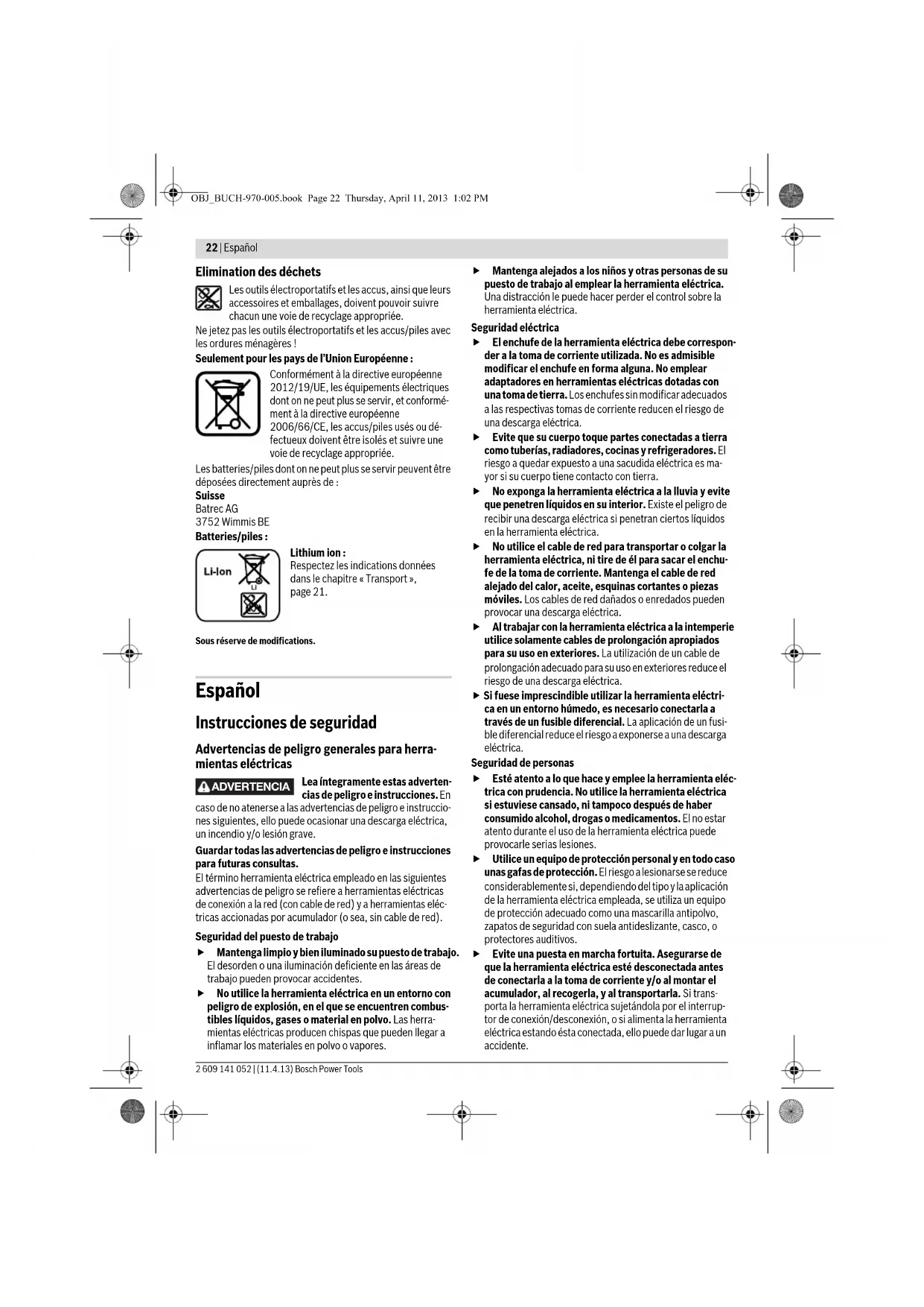 de la longueur de la vis. Entretien et Service Après-Vente Nettoyage et entretien Avant d’effectuer des travaux sur l’appareil (p.ex. tra- vaux d’entretien, changement d’outils, etc.) et pour le transporter ou le stocker, retirez l’accu de l’appareil électroportatif. Il y a risque de blessure lorsqu’on appuie par mégarde sur l’interrupteur Marche/Arrêt. Veillez à ce que l’outil électroportatif ainsi que les ouïes de ventilation soient toujours propres afin d’obtenir un travail impeccable et sûr. Au cas où l’accu ne fonctionnerait plus, veuillez vous adresser à une station de Service Après-Vente agréée pour outillage Bosch. Service Après-Vente et Assistance Notre Service Après-Vente répond à vos questions concer- nant la réparation et l’entretien de votre produit et les pièces de rechange. Vous trouverez des vues éclatées ainsi que des informations concernant les pièces de rechange également sous : www.bosch-pt.com Les conseillers techniques et assistants Bosch sont à votre disposition pour répondre à vos questions concernant nos produits et leurs accessoires. Pour toute demande de renseignement ou commande de pièces de rechange, précisez-nous impérativement le numéro d’article à dix chiffres de l’outil électroportatif indiqué sur la plaque signalétique. France Vous êtes un utilisateur, contactez : Le Service Clientèle Bosch Outillage Electroportatif Tel. : 0811 360122 (coût d’une communication locale) Fax : (01) 49454767 E-Mail : contact.outillage-electroportatif@fr.bosch.com Vous êtes un revendeur, contactez : Robert Bosch (France) S.A.S. Service Après-Vente Electroportatif 126, rue de Stalingrad 93705 DRANCY Cédex Tel. : (01) 43119006 Fax : (01) 43119033 E-Mail : sav.outillage-electroportatif@fr.bosch.com Belgique, Luxembourg Tel. : +32 2 588 0589 Fax : +32 2 588 0595 E-Mail : outillage.gereedschap@be.bosch.com Suisse Tel. : (044) 8471512 Fax : (044) 8471552 E-Mail: Aftersales.Service@de.bosch.com Transport Les batteries Lithium-ion sont soumises aux règlements de transport des matières dangereuses. L’utilisateur peut trans- porter les batteries par voie routière sans mesures supplé- mentaires. Lors d’une expédition par tiers (par ex. : transport aérien ou entreprise de transport), les mesures à prendre spécifiques à l’emballage et au marquage doivent être observées. Dans un tel cas, lors de la préparation de l’envoi, il est impératif de faire appel à un expert en transport des matières dange- reuses. N’expédiez les accus que si le carter n’est pas endommagé. Recouvrez les contacts non protégés et emballez l’accu de manière à ce qu’il ne puisse pas se déplacer dans l’emballage. Veuillez également respecter les règlementations supplémen- taires éventuellement en vigueur. LED Capacité Lumière permanente 3 x verte ≥ 2/3 Lumière permanente 2 x verte ≥1/3 Lumière permanente 1 x verte < 1/3 Lumière clignotante 1 x verte Réserve OBJ_BUCH-970-005.book Page 21 Thursday, April 11, 2013 1:02 PM22 | Español 2 609 141 052 | (11.4.13) Bosch Power Tools Elimination des déchets Les outils électroportatifs et les accus, ainsi que leurs accessoires et emballages, doivent pouvoir suivre chacun une voie de recyclage appropriée. Ne jetez pas les outils électroportatifs et les accus/piles avec les ordures ménagères ! Seulement pour les pays de l’Union Européenne : Conformément à la directive européenne 2012/19/UE, les équipements électriques dont on ne peut plus se servir, et conformé- ment à la directive européenne 2006/66/CE, les accus/piles usés ou dé- fectueux doivent être isolés et suivre une voie de recyclage appropriée. Les batteries/piles dont on ne peut plus se servir peuvent être déposées directement auprès de : Suisse Batrec AG 3752 Wimmis BE Batteries/piles : Lithium ion : Respectez les indications données dans le chapitre « Transport », page 21. Sous réserve de modifications. Español Instrucciones de seguridad Advertencias de peligro generales para herra- mientas eléctricas Lea íntegramente estas adverten- cias de peligro e instrucciones. En caso de no atenerse a las advertencias de peligro e instruccio- nes siguientes, ello puede ocasionar una descarga eléctrica, un incendio y/o lesión grave. Guardar todas las advertencias de peligro e instrucciones para futuras consultas. El término herramienta eléctrica empleado en las siguientes advertencias de peligro se refiere a herramientas eléctricas de conexión a la red (con cable de red) y a herramientas eléc- tricas accionadas por acumulador (o sea, sin cable de red). Seguridad del puesto de trabajo Mantenga limpio y bien iluminado su puesto de trabajo. El desorden o una iluminación deficiente en las áreas de trabajo pueden provocar accidentes. No utilice la herramienta eléctrica en un entorno con peligro de explosión, en el que se encuentren combus- tibles líquidos, gases o material en polvo. Las herra- mientas eléctricas producen chispas que pueden llegar a inflamar los materiales en polvo o vapores. Mantenga alejados a los niños y otras personas de su puesto de trabajo al emplear la herramienta eléctrica. Una distracción le puede hacer perder el control sobre la herramienta eléctrica. Seguridad eléctrica El enchufe de la herramienta eléctrica debe correspon- der a la toma de corriente utilizada. No es admisible modificar el enchufe en forma alguna. No emplear adaptadores en herramientas eléctricas dotadas con una toma de tierra. Los enchufes sin modificar adecuados a las respectivas tomas de corriente reducen el riesgo de una descarga eléctrica. Evite que su cuerpo toque partes conectadas a tierra como tuberías, radiadores, cocinas y refrigeradores. El riesgo a quedar expuesto a una sacudida eléctrica es ma- yor si su cuerpo tiene contacto con tierra. No exponga la herramienta eléctrica a la lluvia y evite que penetren líquidos en su interior. Existe el peligro de re