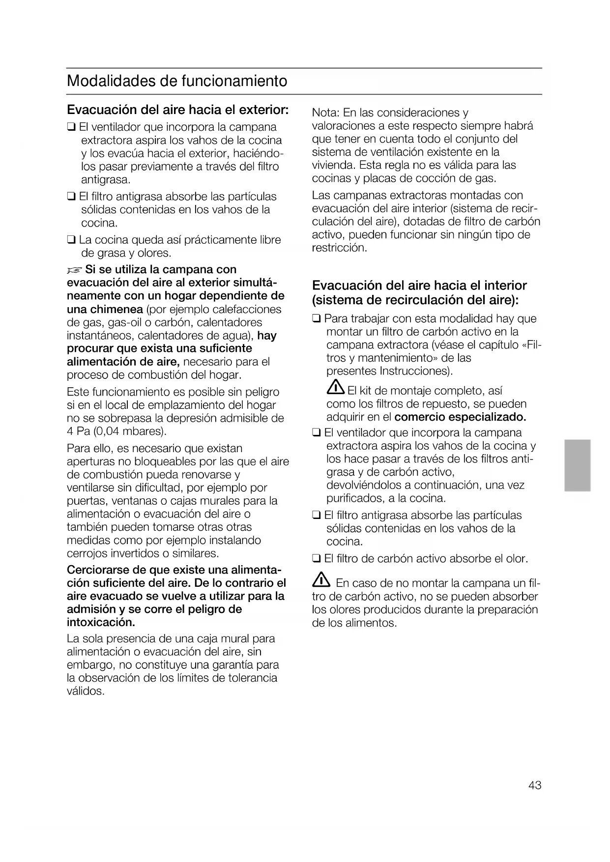 Si se utiliza la campana con evacuación del aire al exterior simultá- neamente con un hogar dependiente de una chimenea (por ejemplo calefacciones de gas, gas-oil o carbón, calentadores instantáneos, calentadores de agua), hay procurar que exista una suficiente alimentación de aire, necesario para el proceso de combustión del hogar. Este funcionamiento es posible sin peligro si en el local de emplazamiento del hogar no se sobrepasa la depresión admisible de 4 Pa (0,04 mbares). Para ello, es necesario que existan aperturas no bloqueables por las que el aire de combustión pueda renovarse y ventilarse sin dificultad, por ejemplo por puertas, ventanas o cajas murales para la alimentación o evacuación del aire o también pueden tomarse otras otras medidas como por ejemplo instalando cerrojos invertidos o similares. Cerciorarse de que existe una alimenta- ción suficiente del aire. De lo contrario el aire evacuado se vuelve a utilizar para la admisión y se corre el peligro de intoxicación. La sola presencia de una caja mural para alimentación o evacuación del aire, sin embargo, no constituye una garantía para la observación de los límites de tolerancia válidos. Nota: En las consideraciones y valoraciones a este respecto siempre habrá que tener en cuenta todo el conjunto del sistema de ventilación existente en la vivienda. Esta regla no es válida para las cocinas y placas de cocción de gas. Las campanas extractoras montadas con evacuación del aire interior (sistema de recir- culación del aire), dotadas de filtro de carbón activo, pueden funcionar sin ningún tipo de restricción. Evacuación del aire hacia el interior (sistema de recirculación del aire): ❑ Para trabajar con esta modalidad hay que montar un filtro de carbón activo en la campana extractora (véase el capítulo «Fil- tros y mantenimiento» de las presentes Instrucciones).