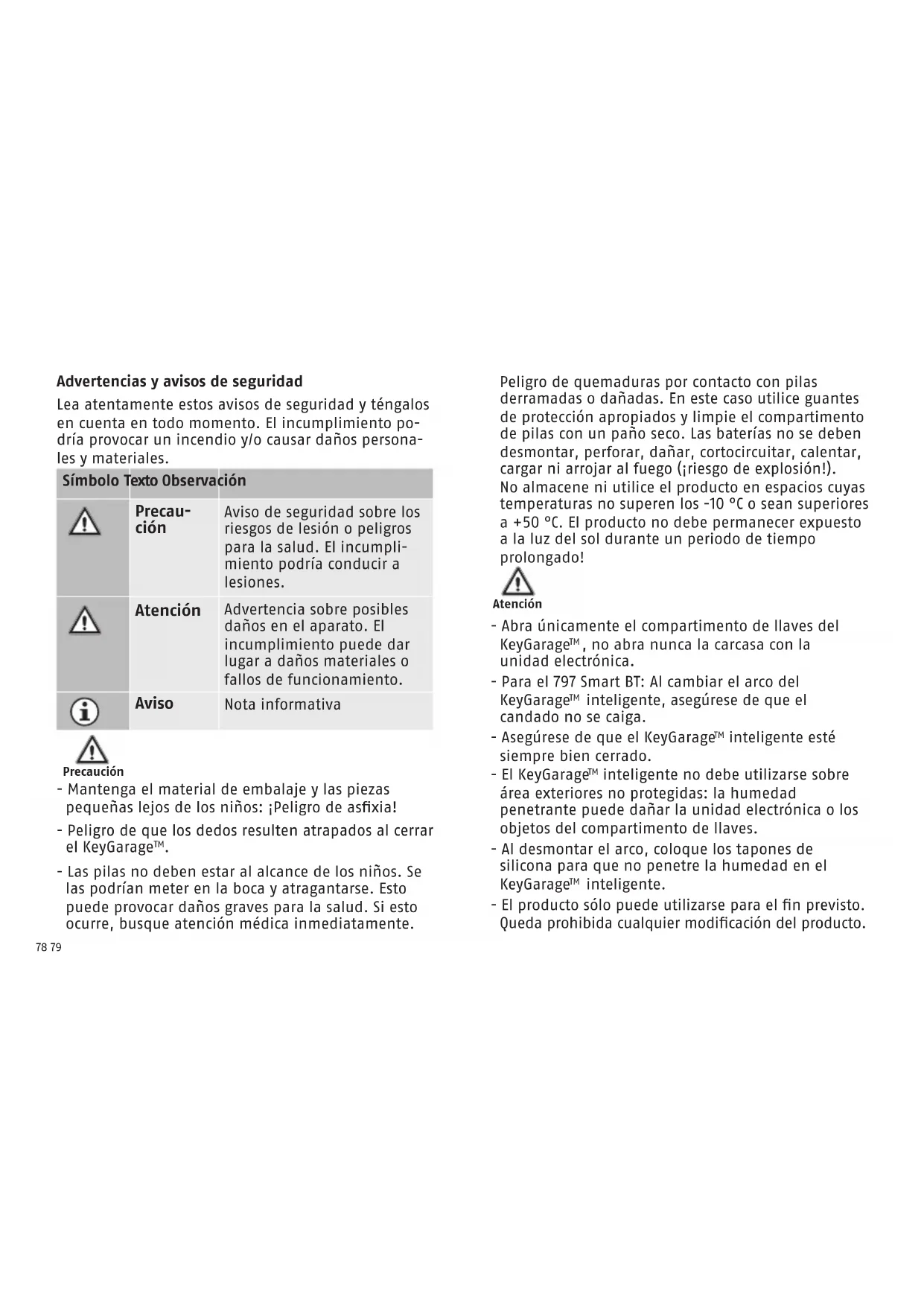 inteligente se puede manejar tanto a través de la aplicación ABUS HomeTec Pro como a través del teclado con un código generado automáticamente. El contenido de este manual de instrucciones y mon- taje está actualizado en el momento de la impresión. Debido a las actualizaciones y el constante desarrollo, es posible que el manual impreso se encuentre des- actualizado en el momento de la puesta en servicio del producto. Por tanto, visite nuestra página web e introduzca „787 Smart-BT“ o „797 Smart-BT“ en el buscador. En la lista de productos, dentro de la pestaña „Descargas“, encontrará la versión más actualizada y completa del manual de instrucciones y montaje.78 79 Advertencias y avisos de seguridad Lea atentamente estos avisos de seguridad y téngalos en cuenta en todo momento. El incumplimiento po- dría provocar un incendio y/o causar daños persona- les y materiales. Símbolo Texto Observación Precau- ción Aviso de seguridad sobre los riesgos de lesión o peligros para la salud. El incumpli- miento podría conducir a lesiones. Atención Advertencia sobre posibles daños en el aparato. El incumplimiento puede dar lugar a daños materiales o fallos de funcionamiento. Aviso Nota informativa Precaución - Mantenga el material de embalaje y las piezas pequeñas lejos de los niños: ¡Peligro de asxia! - Peligro de que los dedos resulten atrapados al cerrar el KeyGarage