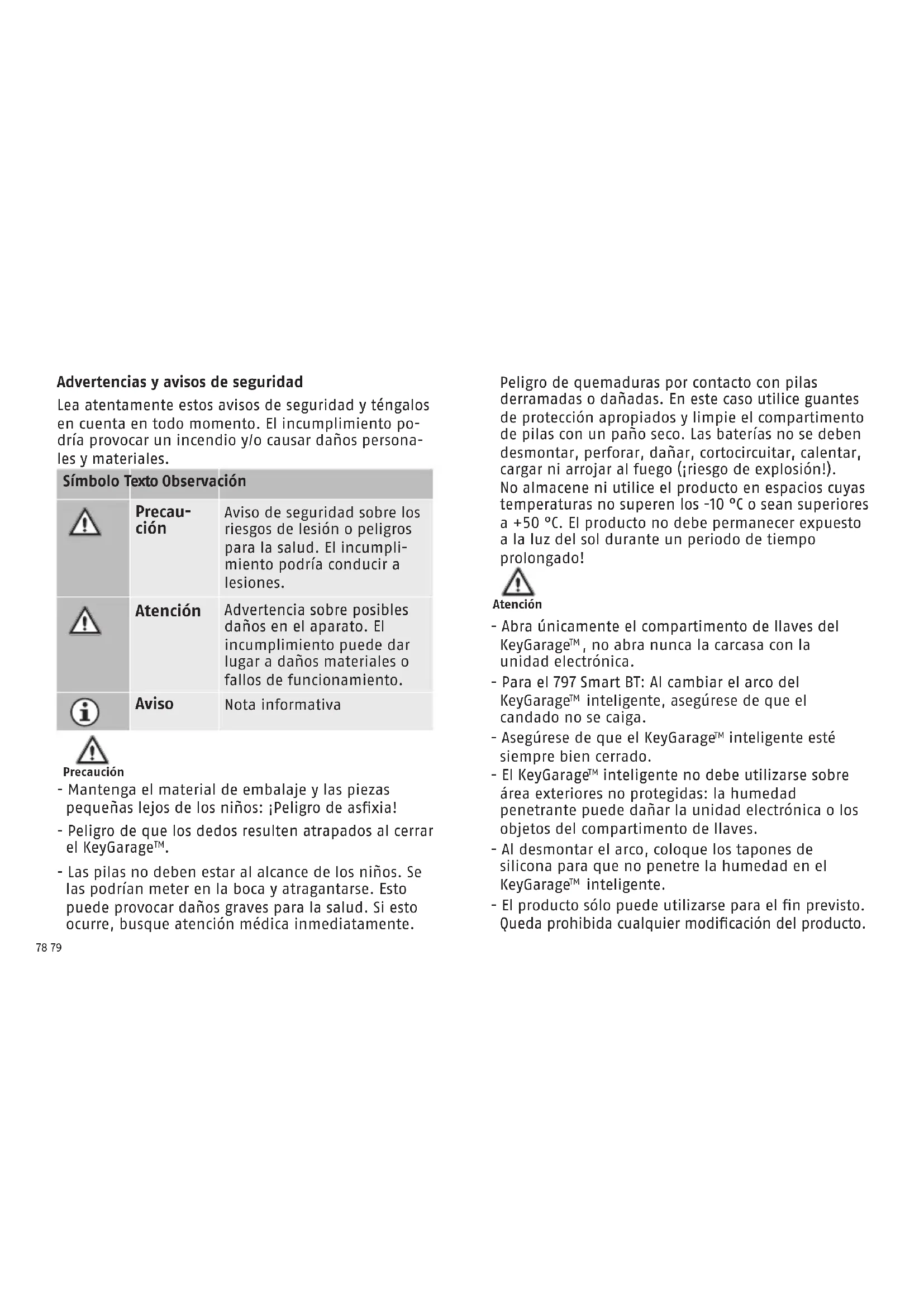 inteligente se puede manejar tanto a través de la aplicación ABUS HomeTec Pro como a través del teclado con un código generado automáticamente. El contenido de este manual de instrucciones y mon- taje está actualizado en el momento de la impresión. Debido a las actualizaciones y el constante desarrollo, es posible que el manual impreso se encuentre des- actualizado en el momento de la puesta en servicio del producto. Por tanto, visite nuestra página web e introduzca „787 Smart-BT“ o „797 Smart-BT“ en el buscador. En la lista de productos, dentro de la pestaña „Descargas“, encontrará la versión más actualizada y completa del manual de instrucciones y montaje.78 79 Advertencias y avisos de seguridad Lea atentamente estos avisos de seguridad y téngalos en cuenta en todo momento. El incumplimiento po- dría provocar un incendio y/o causar daños persona- les y materiales. Símbolo Texto Observación Precau- ción Aviso de seguridad sobre los riesgos de lesión o peligros para la salud. El incumpli- miento podría conducir a lesiones. Atención Advertencia sobre posibles daños en el aparato. El incumplimiento puede dar lugar a daños materiales o fallos de funcionamiento. Aviso Nota informativa Precaución - Mantenga el material de embalaje y las piezas pequeñas lejos de los niños: ¡Peligro de asxia! - Peligro de que los dedos resulten atrapados al cerrar el KeyGarage
