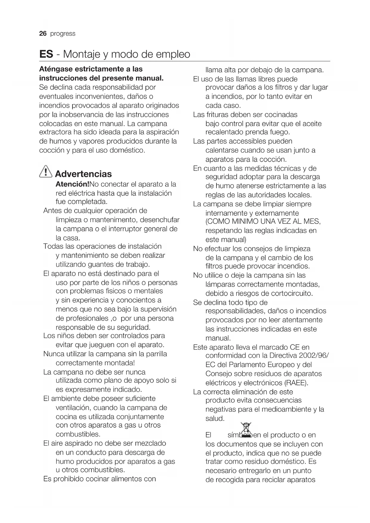 laagste (3.), maximale (4.).24 progress Onderhoud Attentie! Koppel, voor ieder onderhoud, eerst de wasemkap van het elektriciteitsnet af door de stekker weg te trekken of door de hoofdschakelaar van de woning uit te schakelen. De kap moet regelmatig schoon gemaakt worden, zowel binnen als buiten (tenminste met dezelfde regelmaat waarmee de vetfi lters gereinigd worden). Gebruik voor het reinigen een doek die u vochtig maakt met een beetje neutraal vloeibaar reinigingsmiddel. Gebruik geen producten die schuurmiddelen bevatten. GEEN ALCOHOL GEBRUIKEN! Attentie: Als u deze aanwijzingen m.b.t. reiniging van het apparaat en vervanging resp. reiniging van de filters niet opvolgt, kan dat tot brand leiden. Deze aanwijzingen beslist opvolgen! De fabrikant is niet aansprakelijk voor schade aan de motor of schade t.g.v. brand die het gevolg zijn van ondeskundig onderhoud of niet opvolgen van de bovengenoemde veiligheidsvoorschriften. Vetfi lter afb. 1-16 Moet eenmaal per maand worden gereinigd (of als de aanwijzer verzadigde fi lters – indien aanwezig op het model in Uw bezit – deze noodzaak aangeeft) met neutrale reinigingsmiddelen, met de hand of in de vaatwasmachine op lage temperaturen en met een kort programma. Door hem in de vaatwasmachine te wassen kan het metalen vetfi lter ontkleuren, maar dit is niet van invloed op de eigenschappen, die beslist niet veranderen. Koolstoffi lter (alleen voor fi lterend apparaat) afb. 15 Type 20 LONG LIFE - Wasbaar koolstoffi lter De koolstoffi lter kan om de twee maanden gewassen worden in warm water en met geschikte wasmiddelen of in de vaatmachine op 65°C (in het geval van een reiniging in de vaatmachine voer een volledige wascyclus uit en zonder vaten). Verwijder het overtollige water zonder de fi lter te beschadigen, daarna het matje uit de plastic structuur verwijderen en om deze goed te drogen doe het matje in de over voor 10 minuten op 100°C. Vervang het matje om de 3 jaar en elke keer dat het doek beschadigt is. Type 15 - NIET wasbaar koolstoffi lter De verzadiging van de koolstoffi lter vindt plaats na een min of meer geprolongeerd gebruik en hangt af van het soort koken en de regelmaat waarmee de vetfi lter wordt gewassen. In ieder geval moet de fi lter minstens om de 4 maanden vervangen worden. Het kan NIET gewassen of opnieuw gebruikt worden Vervanging lampjes afb. 24 Sluit de stroom af. Attentie! Alvorens de lampjes aan te raken controleer eerst of ze koud zijn. Gebruik alleen halogeen kaarslampjes E14 28W, Ø35mm.progress 2526 progress ES - Montaje y modo de empleo Aténgase estrictamente a las instrucciones del presente manual. Se declina cada responsabilidad por eventuales inconvenientes, daños o incendios provocados al aparato originados por la inobservancia de las instrucciones colocadas en este manual. La campana extractora ha sido ideada para la aspiración de humos y vapores producidos durante la cocción y para el uso doméstico. Advertencias Atención!No conectar el aparato a la red eléctrica hasta que la instalación fue completada. Antes de cualquier operación de limpieza o mantenimento, desenchufar la campana o el interruptor general de la casa. Todas las operaciones de instalación y mantenimiento se deben realizar utilizando guantes de trabajo. El aparato no está destinado para el uso por parte de los niños o personas con problemas fisicos o mentales y sin experiencia y conocientos a menos que no sea bajo la supervisión de profesionales ,o por una persona responsable de su seguridad. Los niños deben ser controlados para evitar que jueguen con el aparato. Nunca utilizar la campana sin la parrilla correctamente montada! La campana no debe ser nunca utilizada como plano de apoyo solo si es expresamente indicado. El ambiente debe poseer suficiente ventilación, cuando la campana de cocina es utilizada conjuntamente con otros aparatos a gas u otros combustibles. El aire aspirado no debe ser mezclado en un conducto para descarga de humo producidos por aparatos a gas u otros combustibles. Es prohibido cocinar alimentos con llama alta por debajo de la campana. El uso de las llamas libres puede provocar daños a los filtros y dar lugar a incendios, por lo tanto evitar en cada caso. Las frituras deben ser cocinadas bajo control para evitar que el aceite recalentado prenda fuego. Las partes accessibles pueden calentarse cuando se usan junto a aparatos para la cocción. En cuanto a las medidas técnicas y de seguridad adoptar para la descarga de humo atenerse estrictamente a las reglas de las autoridades locales. La campana se debe limpiar siempre internamente y externamente (COMO MINIMO UNA VEZ AL MES, respetando las reglas indicadas en este manual) No efectuar los consejos de limpieza de la campana y el cambio de los filtros puede provocar incendios. No utilice o deje la campana sin las lámparas correctamente montadas, debido a riesgos de cortocircuito. Se declina todo tipo de responsabilidades, daños o incendios provocados por no leer atentamente las instrucciones indicadas en este manual. Este aparato lleva el marcado CE en conformidad con la Directiva 2002/96/ EC del Parlamento Europeo y del Consejo sobre residuos de aparatos eléctricos y electrónicos (RAEE). La correcta eliminación de este producto evita consecuencias negativas para el medioambiente y la salud. El símbolo en el producto o en los documentos que se incluyen con el producto, indica que no se puede tratar como residuo doméstico. Es necesario entregarlo en un punto de recogida para reciclar aparatosprogress 27 eléctricos y electrónicos. Deséchelo con arreglo a las normas medioambientales para eliminación de residuos. Para obtener información más detallada sobre el tratamiento, recuperación y reciclaje de este producto, póngase en contacto con el ayuntamiento, con el servicio de eliminación de residuos urbanos o la tienda donde adquirió el producto. Utilización La campana està diseñada para ser utilizada tanto en la forma de extracciòn como