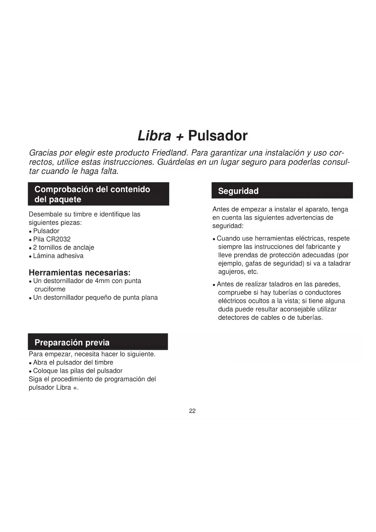 Móntelo con los tornillos que se suministran, (vea la Fig 3). Compruebe el pulsador antes de anclarlo. Evite el anclarlo a estructuras metálicas. Montaje del pulsador del timbre Fig. 324 Se oye un ‘pitido’ en el modo de aprendizaje… ¬● El pulsador que se está programando ya ha sido programado por el timbre. ¬● Si quiere cambiar el icono asociado con el pulsador, use el procedimiento de desprogramación, luego programe el pulsador de nuevo. Se oyen dos ‘pitidos’ después del sonido normal del timbre… ¬● Esto es síntoma de que la pila del pulsador que ha activado el timbre está baja. Coloque una nueva pila, tipo CR2032 Cuando se acciona el pulsador, la luz ámbar no se enciende, o sólo lo hace durante un corto tiempo… ¬● En funcionamiento normal, la luz ámbar se encenderá durante 1 segundo. Cuando la pila esté baja, la luz sólo se encenderá durante poco tiempo. Coloque una pila nueva de tipo CR2032. El timbre no va… ¬● Compruebe si las pilas son del tipo correcto. Use solo pilas alcalinas ¬● Compruebe que las pilas están bien colocadas. ¬● El timbre podría estar fuera del alcance del pulsador. Pruebe el timbre en un sitio diferente. ¬● El timbre podría no haber memorizado la identidad del pulsador. Siga el procedimiento de programación. El timbre no suena… ¬● Compruebe que el mando de volumen no está al mínimo. Hay menos alcance… ¬● Las estructuras metálicas, incluyendo los marcos de puertas de PVC, pueden reducir el alcance del aparato. Evite montar el pulsador o el timbre en las estructuras metálicas o cerca de ellas. ¬● Otros aparatos pueden provocar interferencias de radio y afectar al timbre. ¬● Las paredes y los techos reducen el alcance. ¬● Las baterías bajas reducen el alcance. Cámbielas cada 12 –18 meses. Cuando haga frío, (por debajo de 5ºC), puede que haya que cambiar las pilas con más frecuencia. El pulsador no funciona con mi antiguo equipo Libra… ¬● Libra + no es compatible con el sistema anterior Libra. ¬● Utilice sólo accesorios marcados como Libra + Diagnóstico de averías25 Especificaciones Especificaciones Temperatura de funcionamiento Frecuencia RF – Reino Unido/Europa Potencia RF Tipo de pila Vida de la pila (5 activaciones/día) Índice de protección IP Friedland garantiza este producto durante 2 años a partir de la fecha de compra. Se exige una evidencia objetiva de la compra; esto no afecta a sus derechos legales. Si desea más información sobre nuestro producto, llame a la línea de atención al cliente de Friedland: