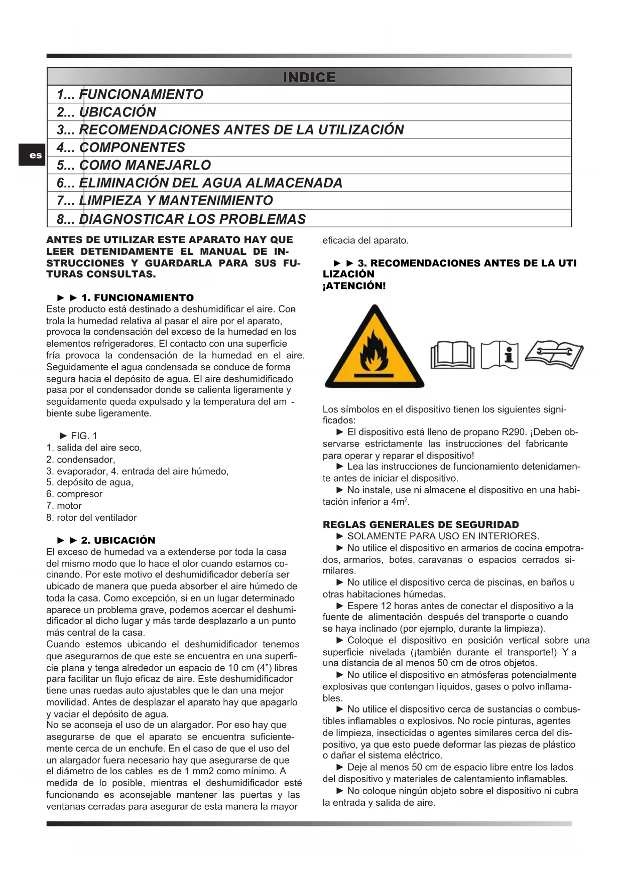 ► SOLAMENTE PARA USO EN INTERIORES. ► No utilice el dispositivo en armarios de cocina empotra- dos, armarios, botes, caravanas o espacios cerrados si- milares. ► No utilice el dispositivo cerca de piscinas, en baños u otras habitaciones húmedas. ► Espere 12 horas antes de conectar el dispositivo a la fuente de alimentación después del transporte o cuando se haya inclinado (por ejemplo, durante la limpieza). ► Coloque el dispositivo en posición vertical sobre una supercie nivelada (¡también durante el transporte!) Y a una distancia de al menos 50 cm de otros objetos. ► No utilice el dispositivo en atmósferas potencialmente explosivas que contengan líquidos, gases o polvo inama- bles. ► No utilice el dispositivo cerca de sustancias o combus- tibles inamables o explosivos. No rocíe pinturas, agentes de limpieza, insecticidas o agentes similares cerca del dis- positivo, ya que esto puede deformar las piezas de plástico o dañar el sistema eléctrico. ► Deje al menos 50 cm de espacio libre entre los lados del dispositivo y materiales de calentamiento inamables. ► No coloque ningún objeto sobre el dispositivo ni cubra la entrada y salida de aire. INDICE INDICE 1... FUNCIONAMIENTO 2... UBICACIÓN