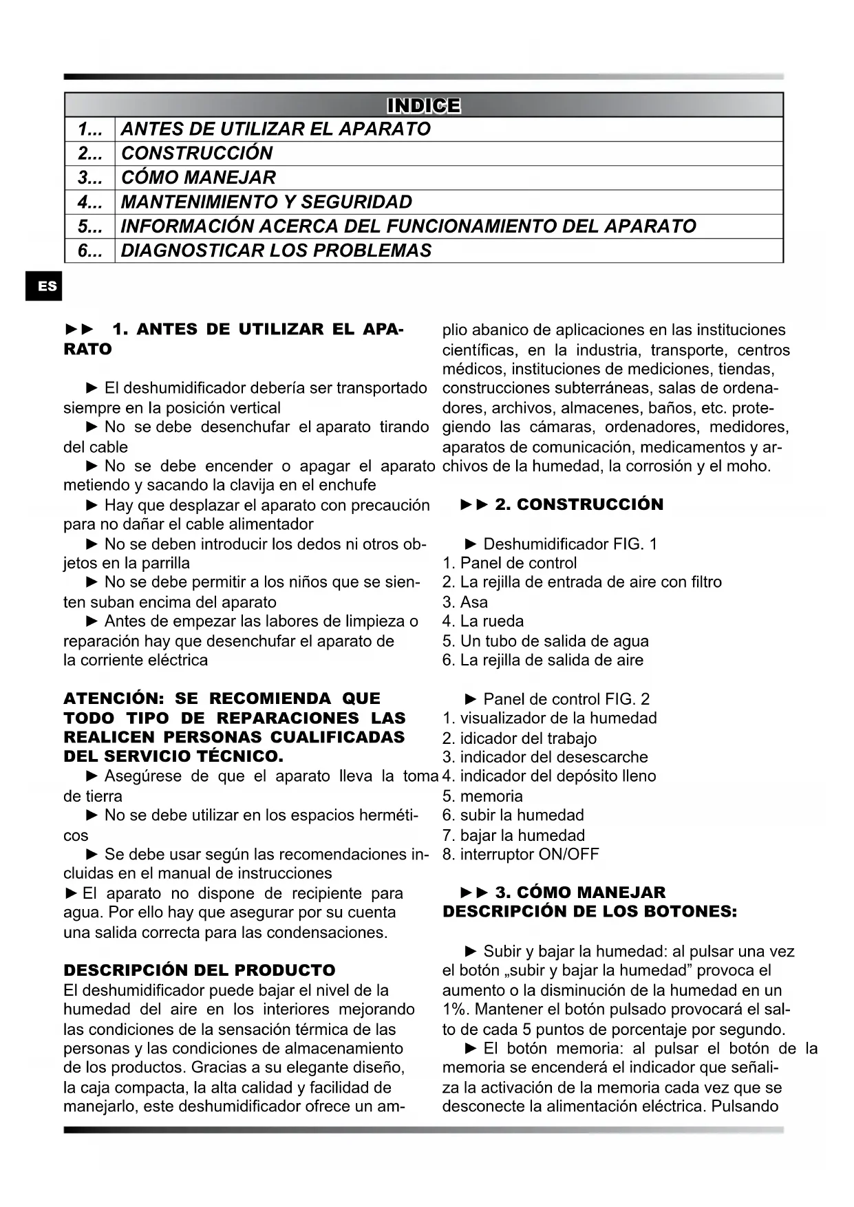 DEL SERVICIO TÉCNICO. ► Asegúrese de que el aparato lleva la toma de tierra ► No se debe utilizar en los espacios herméti- cos ► Se debe usar según las recomendaciones in- cluidas en el manual de instrucciones ► El aparato no dispone de recipiente para agua. Por ello hay que asegurar por su cuenta una salida correcta para las condensaciones. DESCRIPCIóN DEL PRODUCTO El deshumidicador puede bajar el nivel de la humedad del aire en los interiores mejorando las condiciones de la sensación térmica de las personas y las condiciones de almacenamiento de los productos. Gracias a su elegante diseño, la caja compacta, la alta calidad y facilidad de manejarlo, este deshumidicador ofrece un am- plio abanico de aplicaciones en las instituciones cientícas, en la industria, transporte, centros médicos, instituciones de mediciones, tiendas, construcciones subterráneas, salas de ordena- dores, archivos, almacenes, baños, etc. prote- giendo las cámaras, ordenadores, medidores, aparatos de comunicación, medicamentos y ar- chivos de la humedad, la corrosión y el moho. ► 2. CONSTRUCCIóN ► Deshumidicador FIG. 1