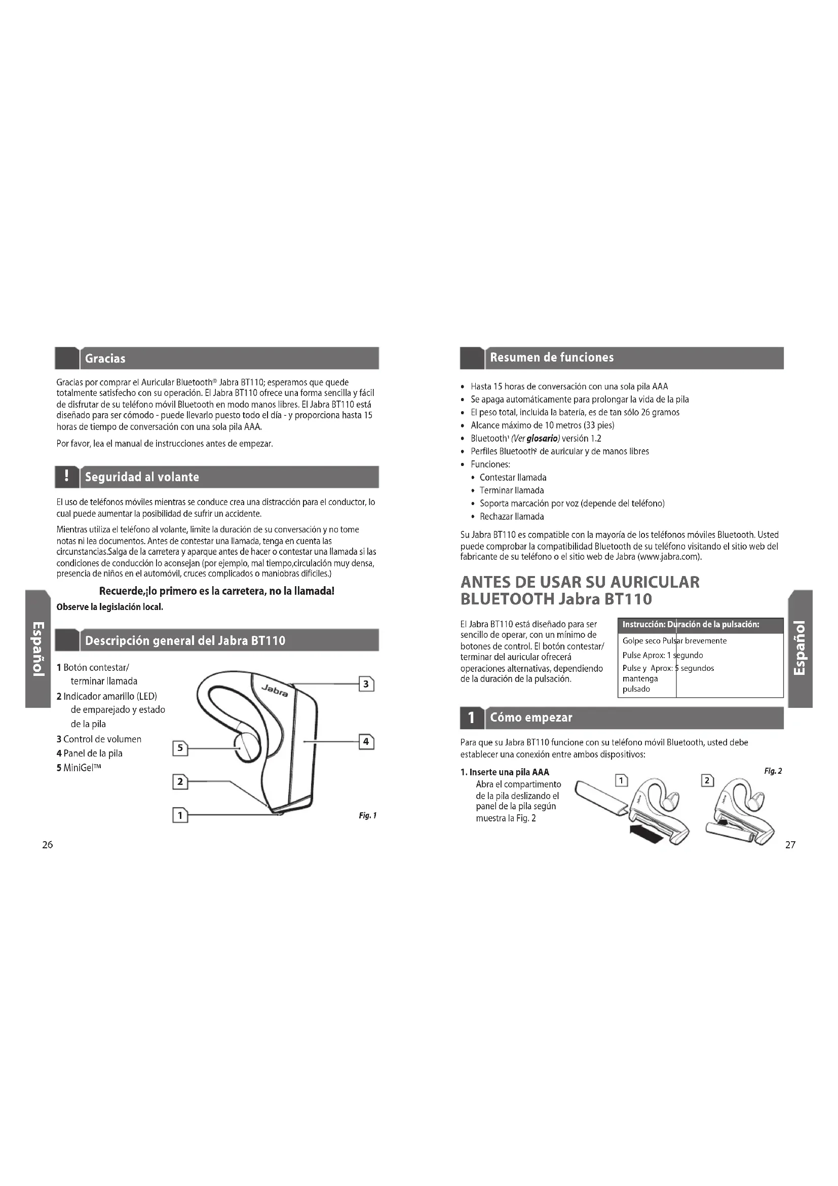 Gracias por comprar el Auricular Bluetooth® Jabra BT110; esperamos que quedetotalmente satisfecho con su operación. El Jabra BT110 ofrece una forma sencilla y fácilde disfrutar de su teléfono móvil Bluetooth en modo manos libres. El Jabra BT110 estádiseñado para ser cómodo - puede llevarlo puesto todo el día - y proporciona hasta 15horas de tiempo de conversación con una sola pila AAA.Por favor, lea el manual de instrucciones antes de empezar.El uso de teléfonos móviles mientras se conduce crea una distracción para el conductor, locual puede aumentar la posibilidad de sufrir un accidente.Mientras utiliza el teléfono al volante, limite la duración de su conversación y no tomenotas ni lea documentos. Antes de contestar una llamada, tenga en cuenta lascircunstancias.Salga de la carretera y aparque antes de hacer o contestar una llamada si lascondiciones de conducción lo aconsejan (por ejemplo, mal tiempo,circulación muy densa,presencia de niños en el automóvil, cruces complicados o maniobras difíciles.) Recuerde,¡lo primero es la carretera, no la llamada! Observe la legislación local.