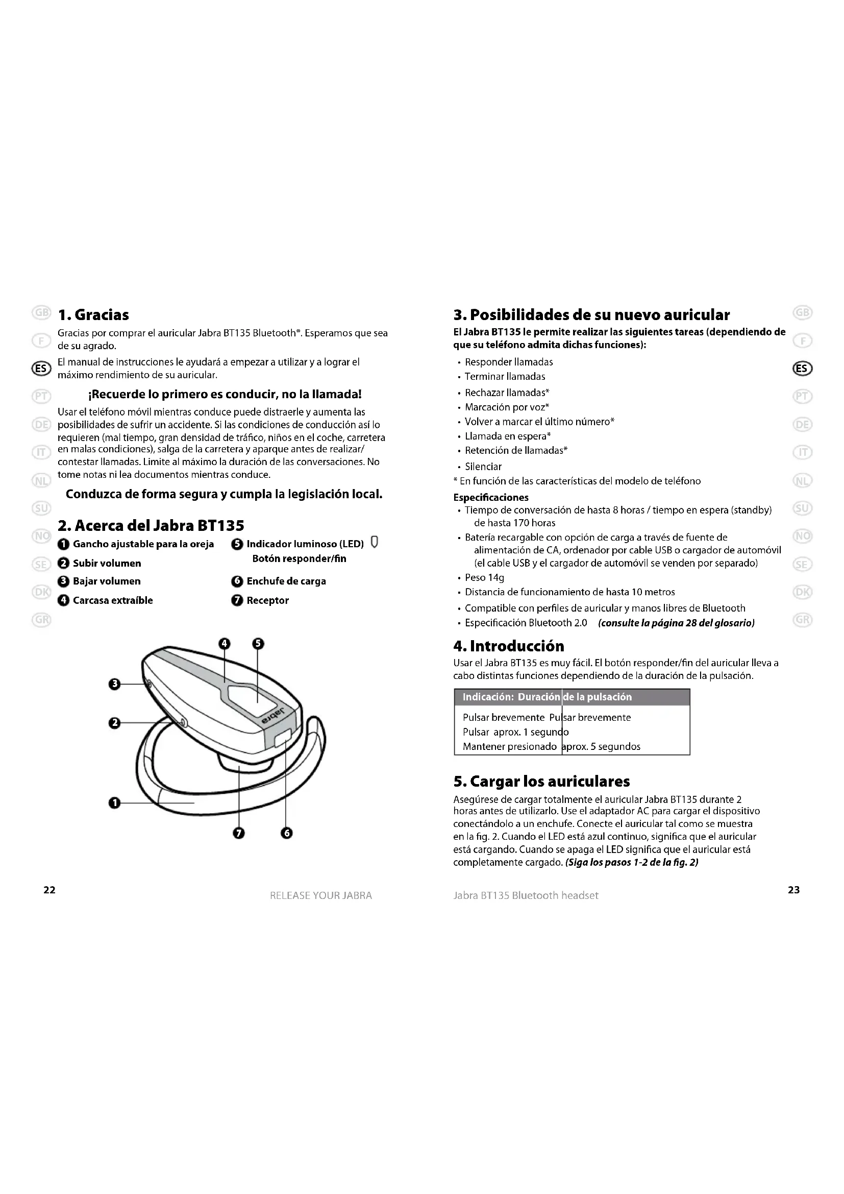 Gracias por comprar el auricular Jabra BT135 Bluetooth®. Esperamos que sea de su agrado. El manual de instrucciones le ayudará a empezar a utilizar y a lograr el máximo rendimiento de su auricular. ¡Recuerde lo primero es conducir, no la llamada! Usar el teléfono móvil mientras conduce puede distraerle y aumenta las posibilidades de sufrir un accidente. Si las condiciones de conducción así lo requieren (mal tiempo, gran densidad de tráco, niños en el coche, carretera en malas condiciones), salga de la carretera y aparque antes de realizar/ contestar llamadas. Limite al máximo la duración de las conversaciones. No tome notas ni lea documentos mientras conduce. Conduzca de forma segura y cumpla la legislación local.