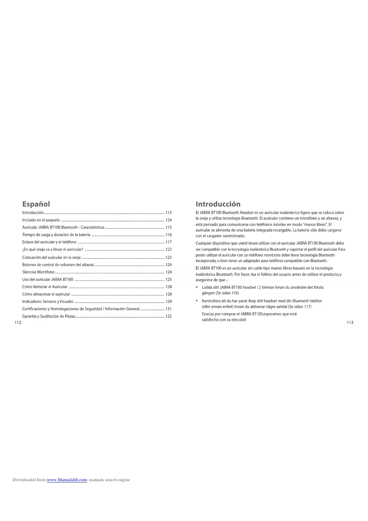 JABRA (GN Netcom) aanvaardt geen enkele aansprakelijkheid voor een defect of schade die is ontstaan tijdens de verzending.Indien reparatiewerkzaamheden aan JABRA (GN Netcom) producten worden uitgevoerd door onbevoegde derden,vervalt de garantie. Downloaded from www.Manualslib.com manuals search engine113 Introducción El JABRA BT100 Bluetooth Headset es un auricular inalámbrico ligero que se coloca sobre la oreja y utiliza tecnología Bluetooth. El auricular contiene un micrófono y un altavoz, y está pensado para comunicarse con teléfonos móviles en modo "manos libres". El auricular se alimenta de una batería integrada recargable. La batería sólo debe cargarse con el cargador suministrado. Cualquier dispositivo que usted desee utilizar con el auricular JABRA BT100 Bluetooth debe ser compatible con la tecnología inalámbrica Bluetooth y soportar el perfil del auricular.Para poder utilizar el auricular con un teléfono móvil,éste debe llevar tecnología Bluetooth incorporada, o bien tener un adaptador para teléfono compatible con Bluetooth. El JABRA BT100 es un auricular sin cable tipo manos libres basado en la tecnología inalámbrica Bluetooth. Por favor, lea el folleto del usuario antes de utilizar el producto,y asegúrese de que –