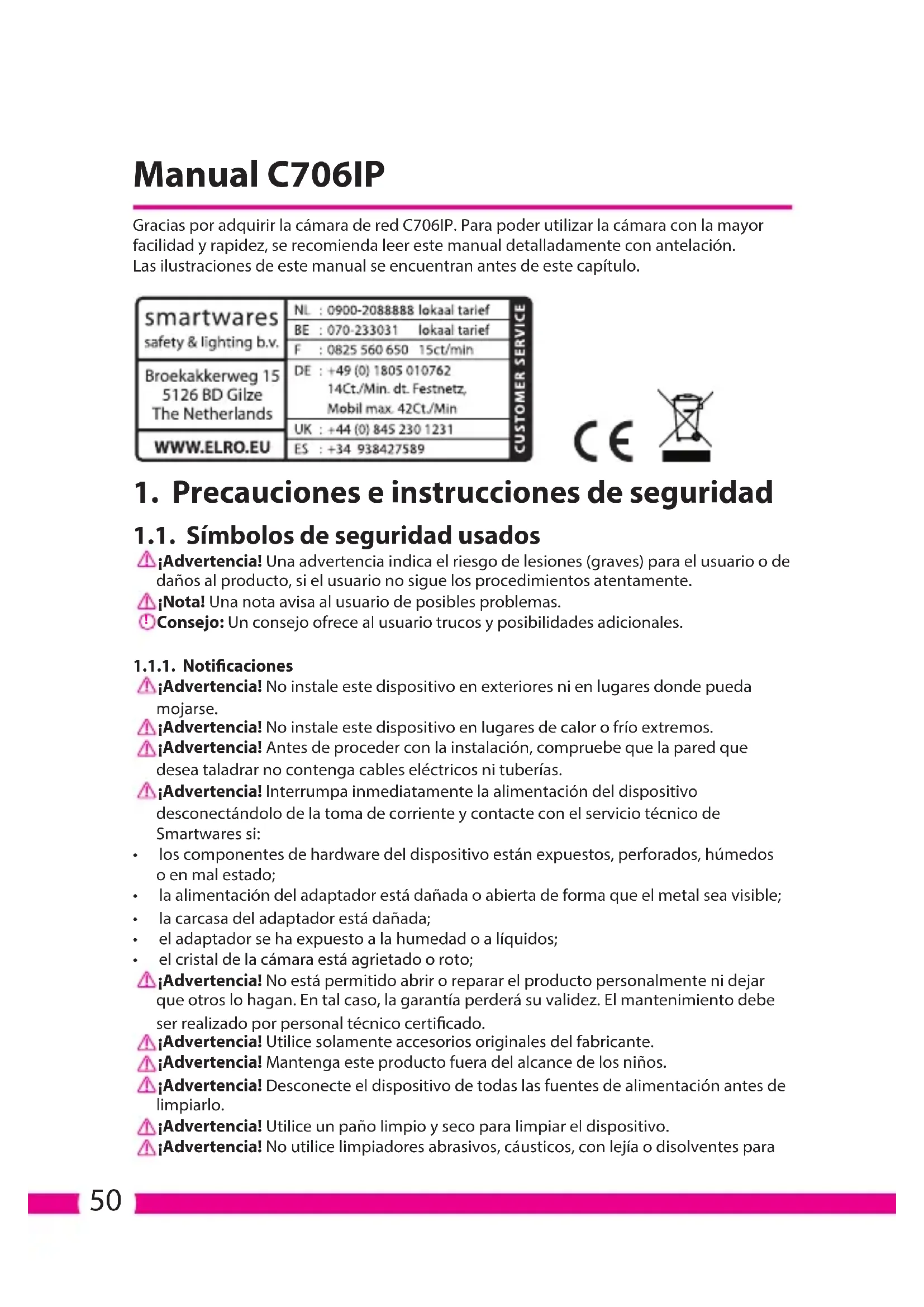 Cet appareil bénécie d'une garantie limitée de 3 ans. Pour connaître toutes les conditions de la garantie, surfez sur: www.elro.eu.50 Manual C706IP Gracias por adquirir la cámara de red C706IP. Para poder utilizar la cámara con la mayor facilidad y rapidez, se recomienda leer este manual detalladamente con antelación. Las ilustraciones de este manual se encuentran antes de este capítulo.