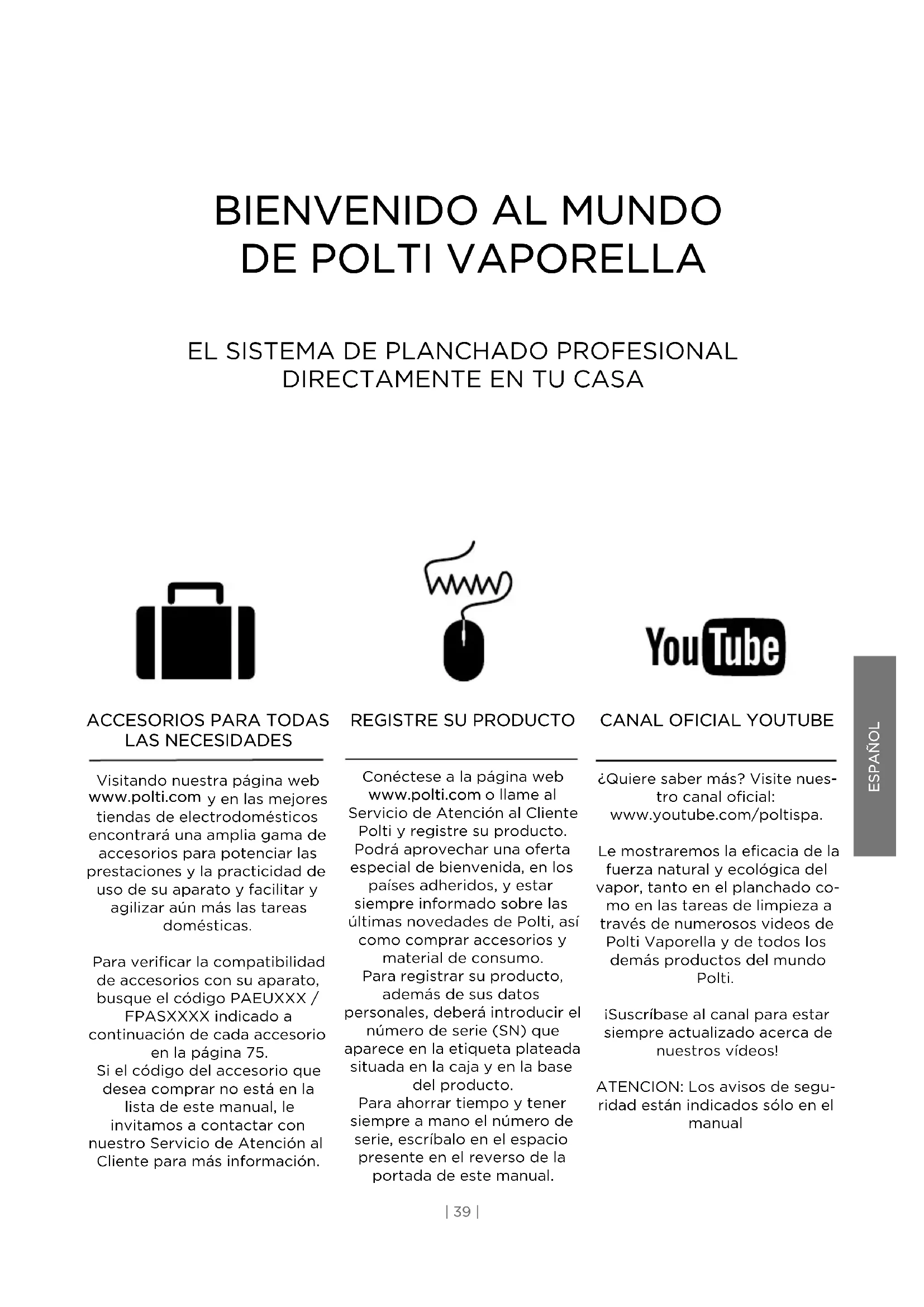 ¿Quiere saber más? Visite nues- tro canal oficial: www.youtube.com/poltispa. Le mostraremos la eficacia de la fuerza natural y ecológica del vapor, tanto en el planchado co- mo en las tareas de limpieza a través de numerosos videos de Polti Vaporella y de todos los demás productos del mundo Polti. ¡Suscríbase al canal para estar siempre actualizado acerca de nuestros vídeos! ATENCION: Los avisos de segu- ridad están indicados sólo en el manualADVERTENCIAS DE SEGURIDAD ADVERTENCIAS IMPORTANTES ATENCIÓN: ANTES DE UTILIZAR EL APARATO, LEA
