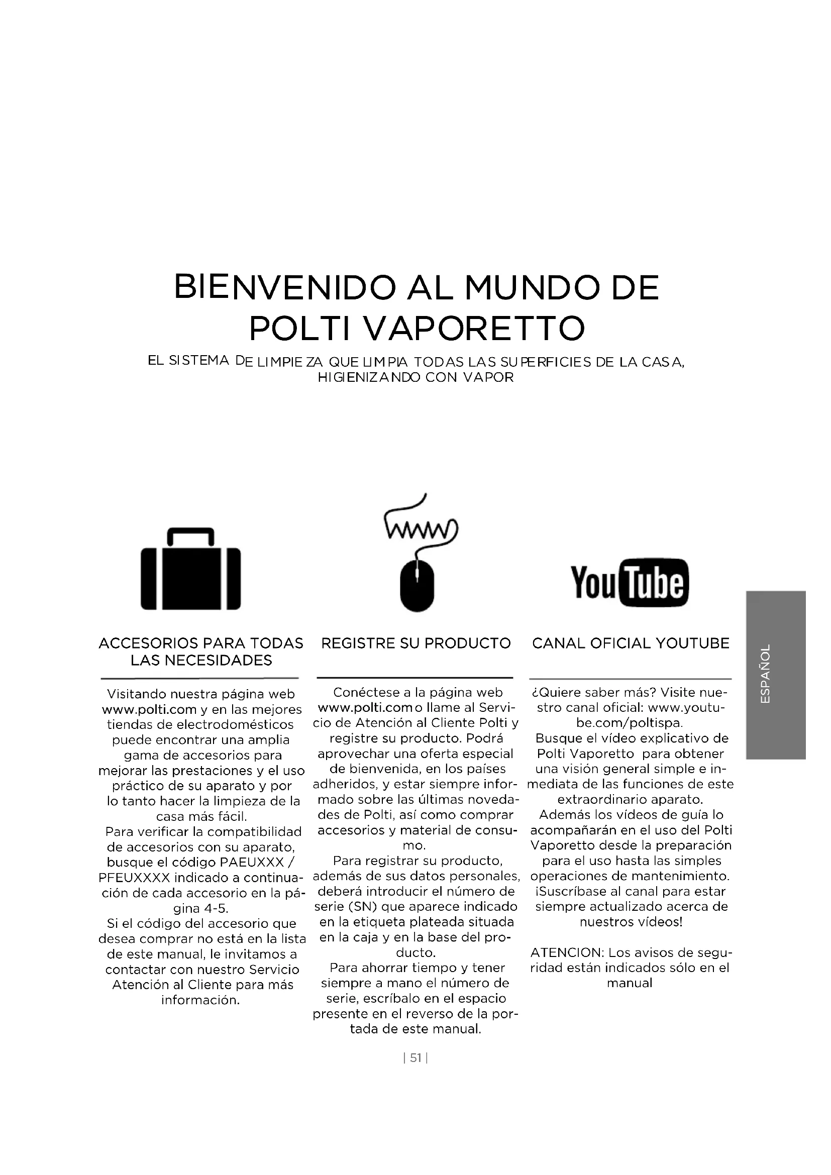 ¿Quiere saber más? Visite nue- stro canal oficial: www.youtu- be.com/poltispa. Busque el vídeo explicativo de Polti Vaporetto para obtener una visión general simple e in- mediata de las funciones de este extraordinario aparato. Además los vídeos de guía lo acompañarán en el uso del Polti Vaporetto desde la preparación para el uso hasta las simples operaciones de mantenimiento. ¡Suscríbase al canal para estar siempre actualizado acerca de nuestros vídeos! ATENCION: Los avisos de segu- ridad están indicados sólo en el manual| 52 | ESPAÑOL