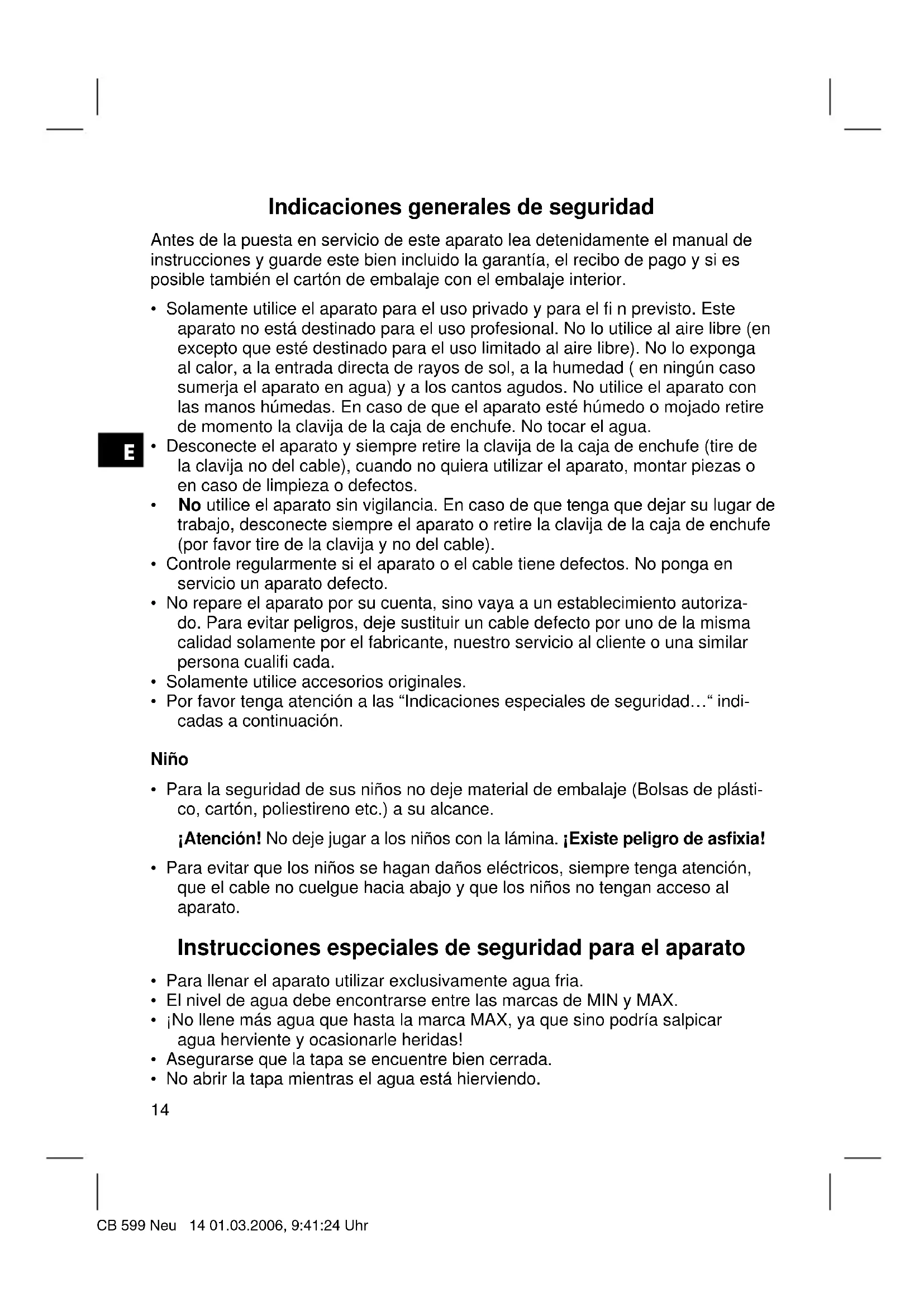 - Solamente utilise el aparato para el uso privado y para el fi n previsto. Este aparato no está destinado para el uso profesional. No lo utilise al aire libre (en excepto que estédestinado para el uso limitado al aire libre).No lo exponga al calor, a la entrada directa de rayos de sol, a la humedad ( en ningún caso sumerja el aparato en agua) y a los cantos agudos. No utilise el aparato con las manos humedes. En caso de que el aparato esté humedo o要去 retire de momento la clavija de la caja de enchufe. No tocar el agua.