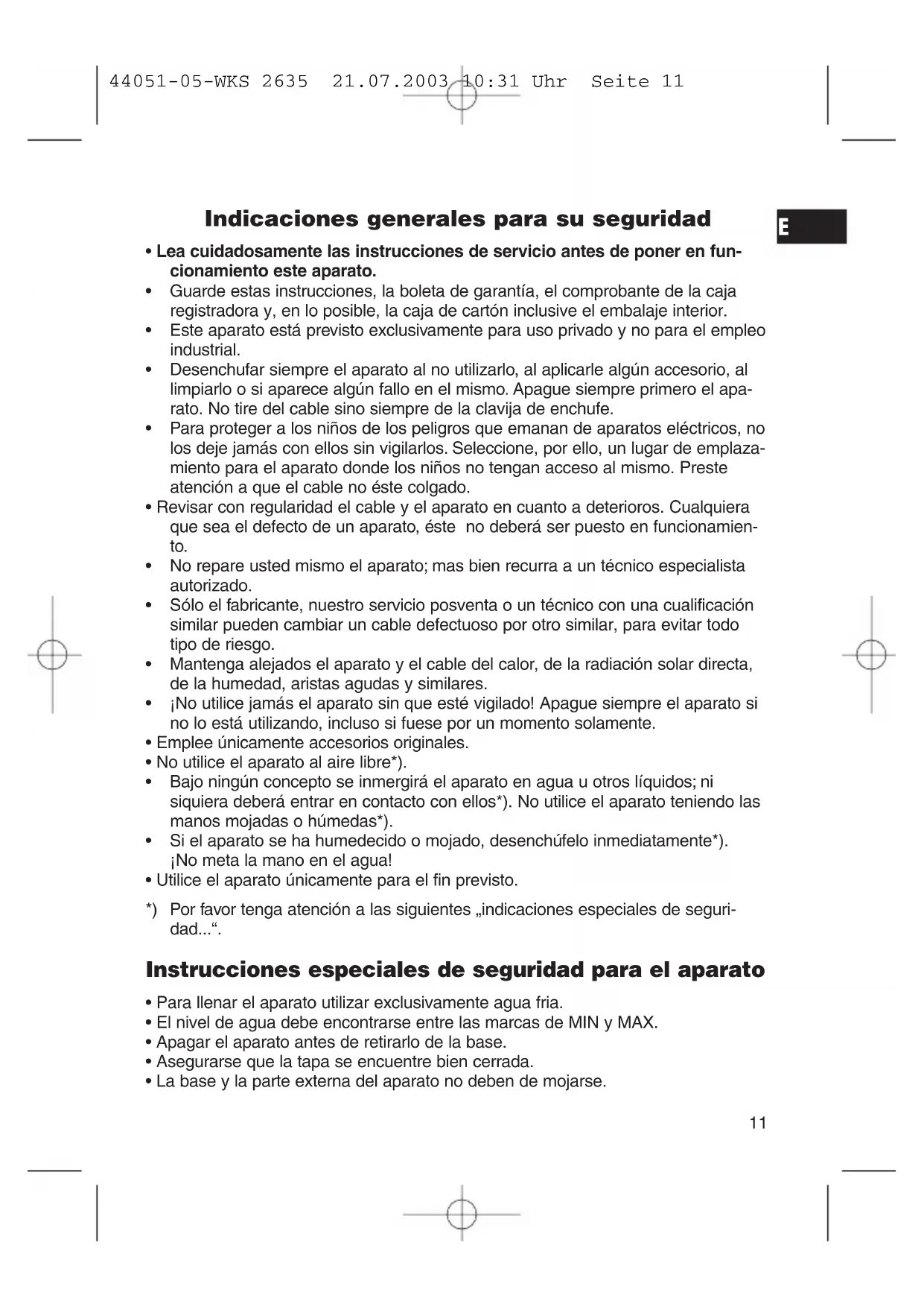 Por favor lea las intrusiones de uso cuidadosamente y guarde estas en un lugar seguro. Antes del primer usocede hervir en el aparato 2 vezes agua fresca. Por favor solamente utilise agua clara sin aditivos.