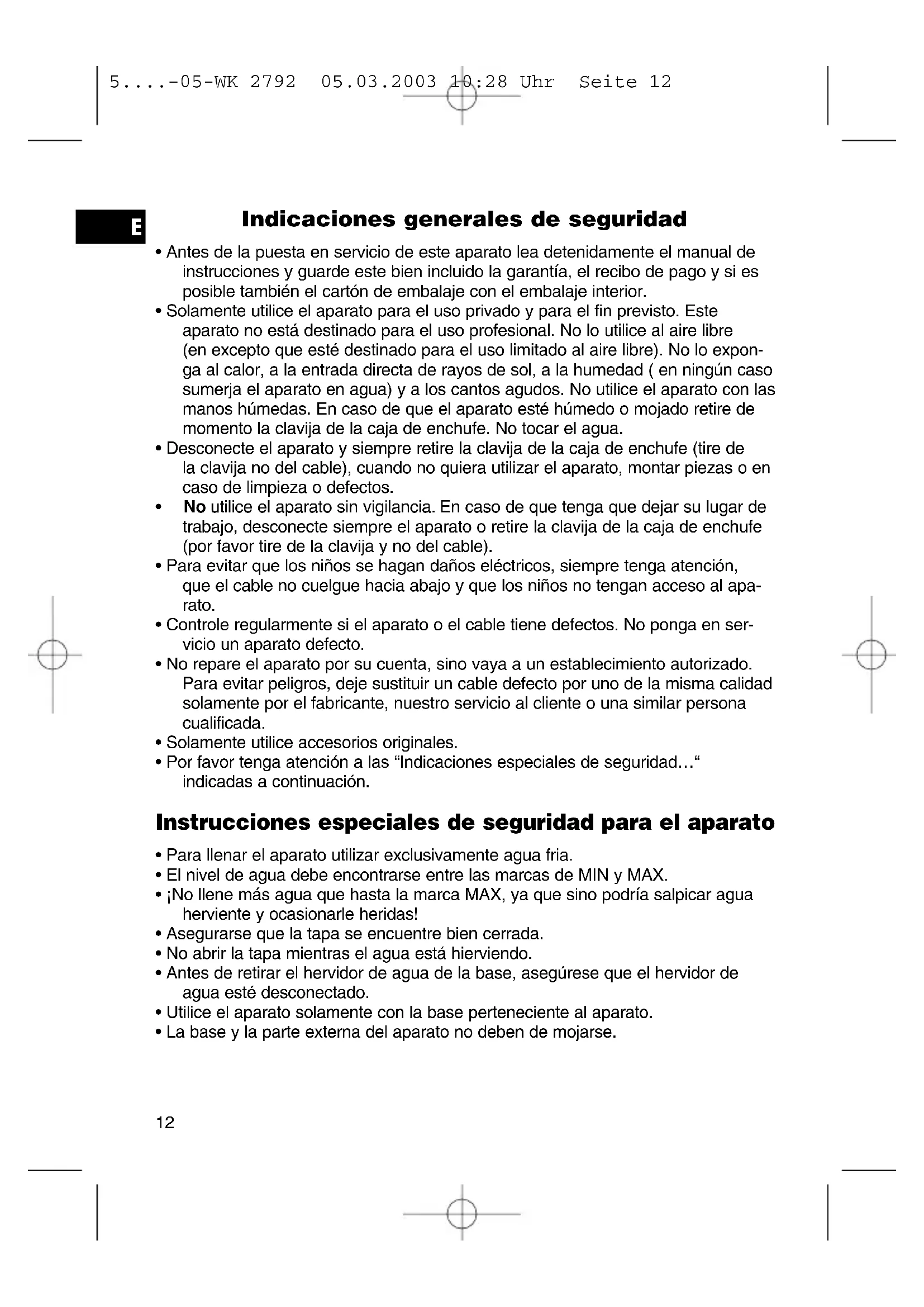 5....-05-WK 2792 05.03.2003 10:28 Uhr Seite 12Puesta en operación del aparato Por favor lea las intrucciones de uso cuidadosamente y guarde estas en un lugar seguro. Antes del primer uso deje hervir en el aparato 2 veces agua fresca. Por favor solamente utilice agua clara sin aditivos. Instrucción para cargar el aparato