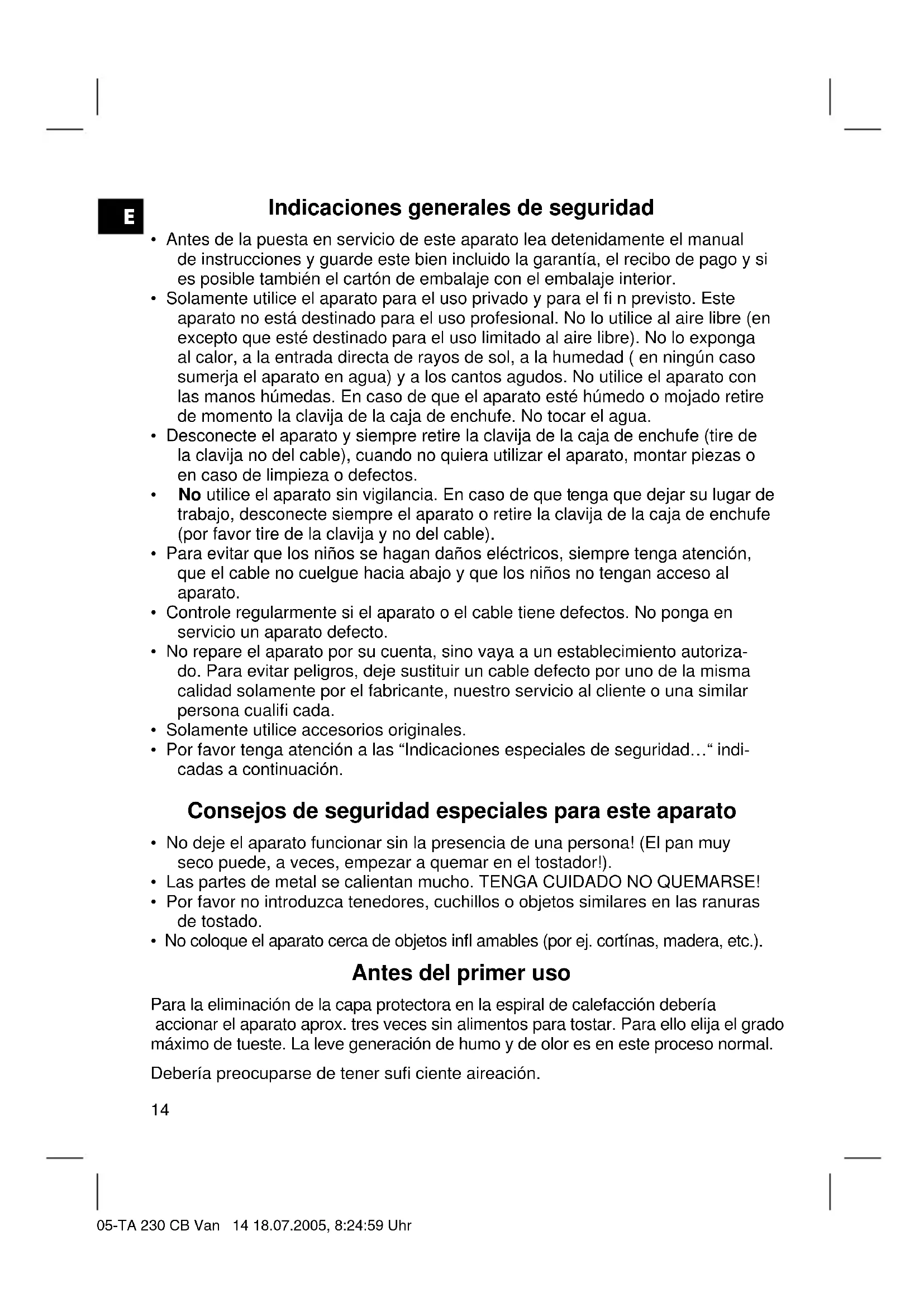 - Solamente utilise el aparato para el uso privado y para el fiñ previsto. Este aparato no está destinado para el uso profesional. No lo utilise al aire libre (en excepto que está destinado para el uso limitado al aire libre). No lo exponga al calor, a la entrada directa de rayos de sol, a la humedad (en ningún caso sumerja el aparato en agua) y a los cantos agudos. No utilise el aparato con las manos humedes. En caso de que el aparato está humedo o要去gether de momento la clavija de la caja de enchufe. No tocar el agua.