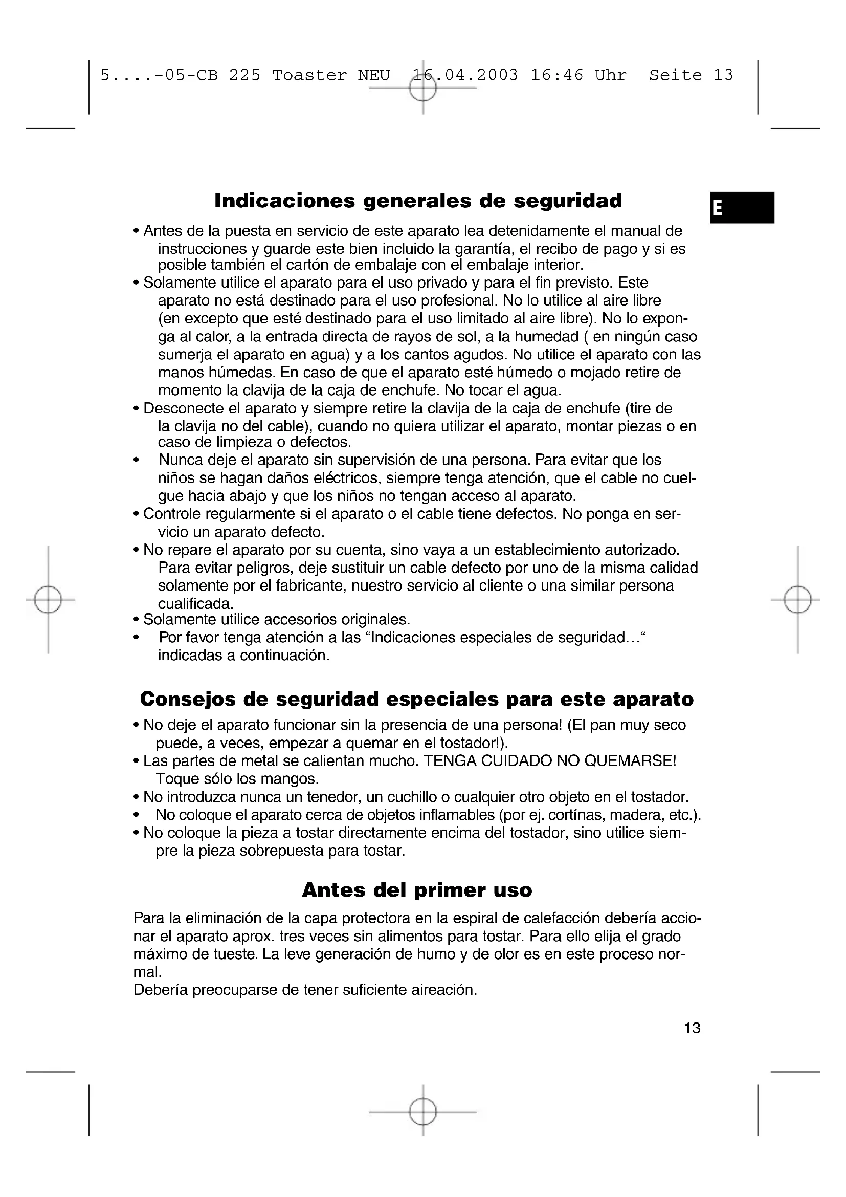 - No coloque la pieza a tostar directamente encima del tostador, sino utilice siem- pre la pieza sobrepuesta para tostar. Antes del primer uso Para la eliminación de la capa protectora en la espiral de calefacción debería accio- nar el aparato aprox. tres veces sin alimentos para tostar. Para ello elija el grado máximo de tueste. La leve generación de humo y de olor es en este proceso nor- mal. Debería preocuparse de tener suficiente aireación.
