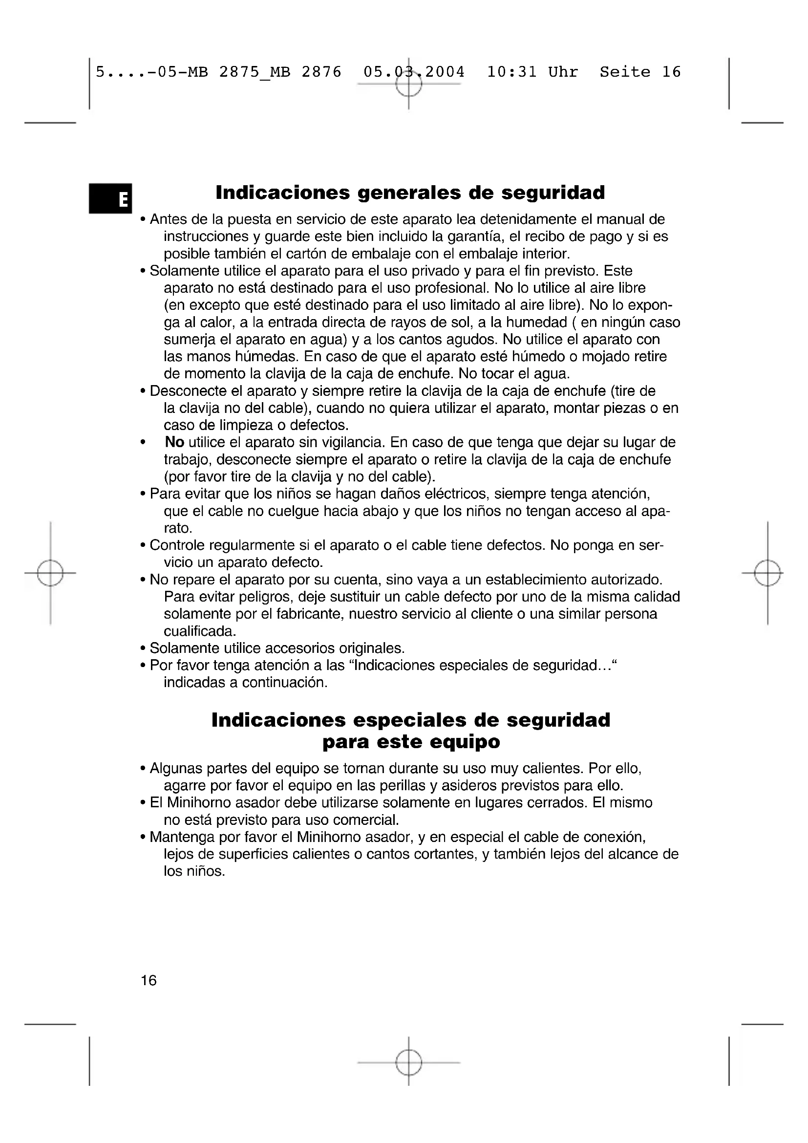 - Mantenga por favor el Minihorno asador, y en especial el cable de conexión, lejos de superficies calientes o cantos cortantes, y también lejos del alcance de los niños.