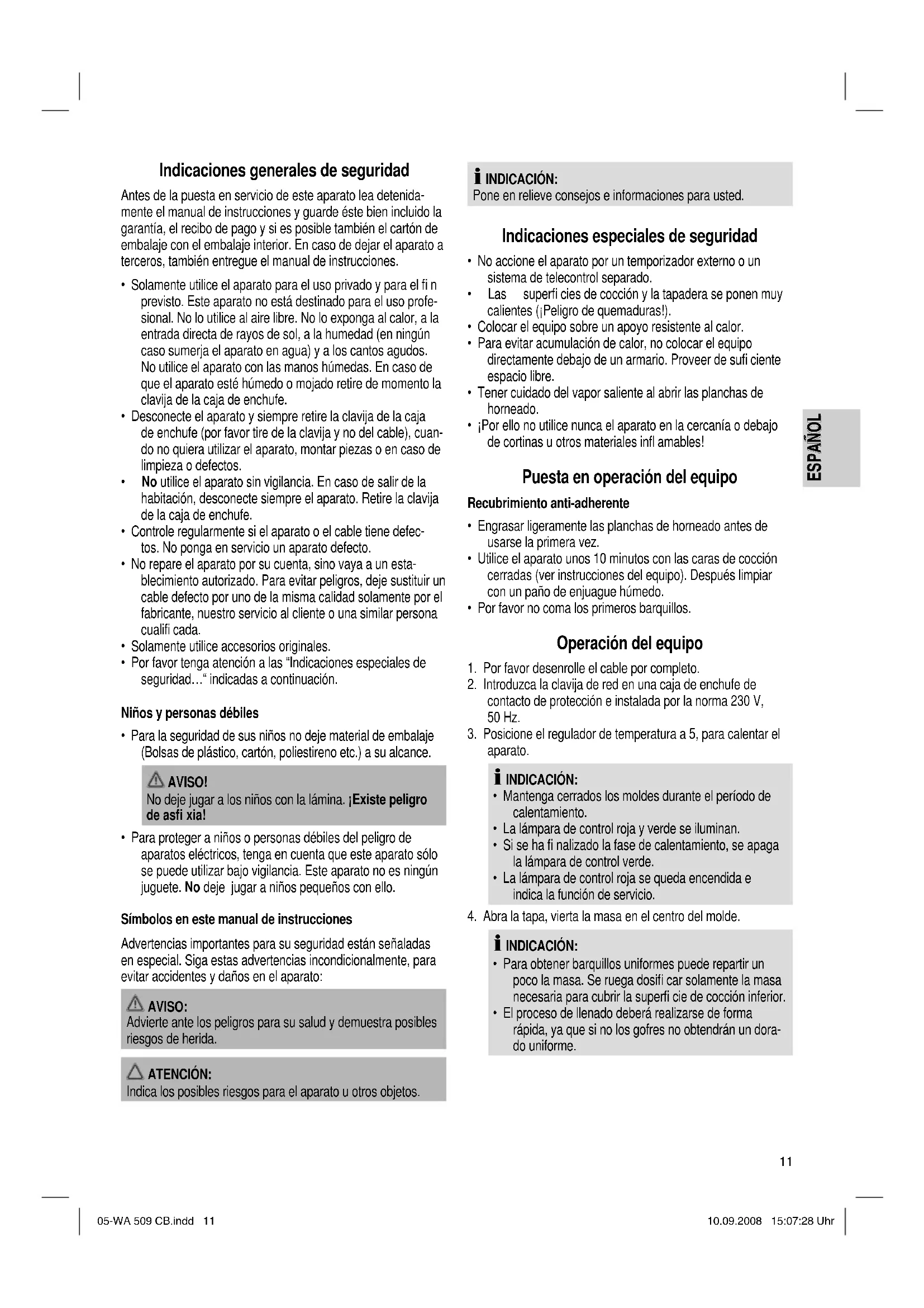 - El proceso de llenado deberá realizarse de forma rápida, ya que si no los gofres no obtendrán un dora- do uniforme. 05-WA 509 CB.indd 1105-WA 509 CB.indd 11 10.09.2008 15:07:28 Uhr10.09.2008 15:07:28 Uhr12 ESPAÑOL ESPAÑOL
