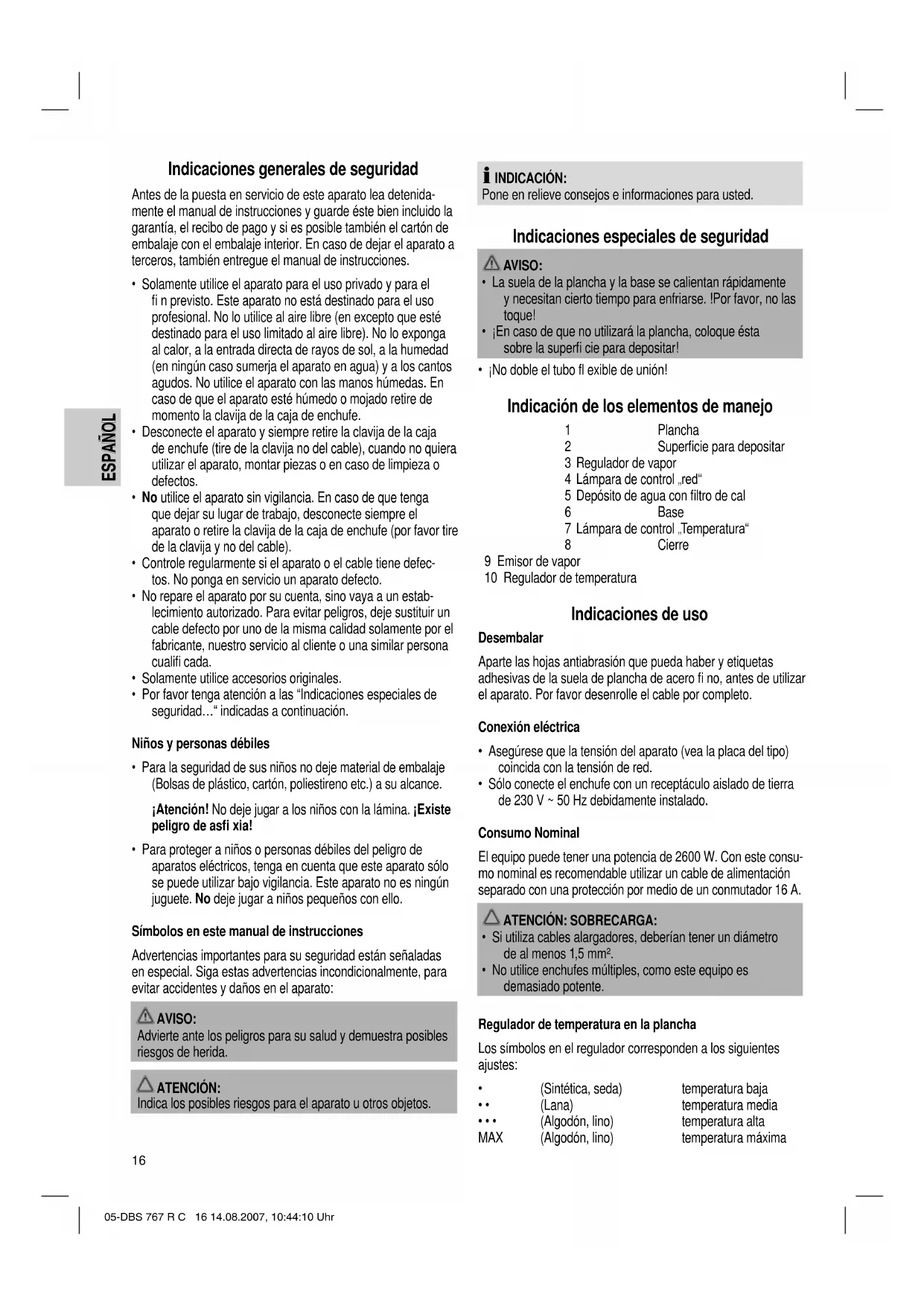 - ¡No doble el tubo fl exible de unión! Indicación de los elementos de manejo 1 Plancha 2 Superfi cie para depositar 3 Regulador de vapor 4 Lámpara de control „red“ 5 Depósito de agua con fi ltro de cal 6 Base 7 Lámpara de control „Temperatura“ 8 Cierre 9 Emisor de vapor 10 Regulador de temperatura Indicaciones de uso Desembalar Aparte las hojas antiabrasión que pueda haber y etiquetas adhesivas de la suela de plancha de acero fi no, antes de utilizar el aparato. Por favor desenrolle el cable por completo. Conexión eléctrica