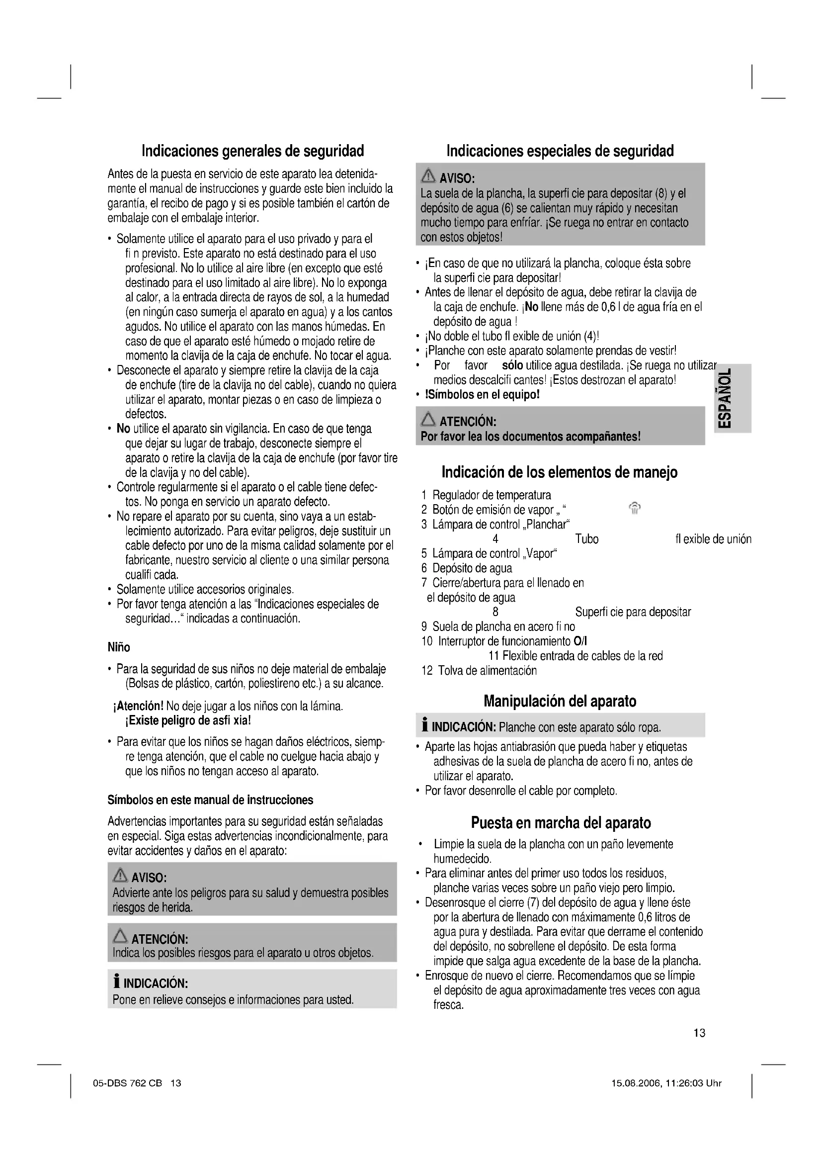 - Enrosque de nuevo el cierre. Recomendamos que se límpie el depósito de agua aproximadamente tres veces con agua fresca. 05-DBS 762 CB 13 15.08.2006, 11:26:03 Uhr14 ESPAÑOL ESPAÑOL