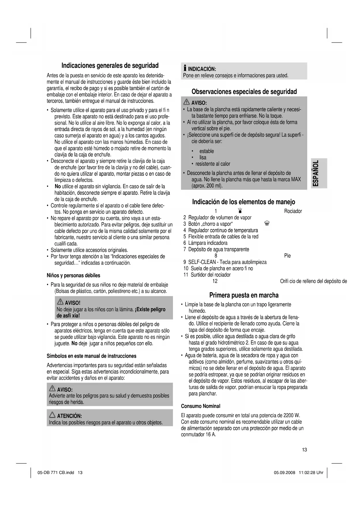 - Agua de batería, agua de la secadora de ropa y agua con aditivos (como almidón, perfume, suavizantes u otros quí- micos) no se debe llenar en el depósito de agua. El aparato se podría estropear, ya que se podrían originar residuos en el depósito de vapor. Estos residuos, al escapar de las aber- turas de salida de vapor, podrían ensuciar la ropa preparada para planchar. Consumo Nominal El aparato puede consumir en total una potencia de 2200 W. Con este consumo nominal es recomendable utilizar un cable de alimentación separado con una protección por medio de un conmutador 16 A. 05-DB 771 CB.indd 1305-DB 771 CB.indd 13 05.09.2008 11:02:28 Uhr05.09.2008 11:02:28 Uhr14 ESPAÑOL ESPAÑOL