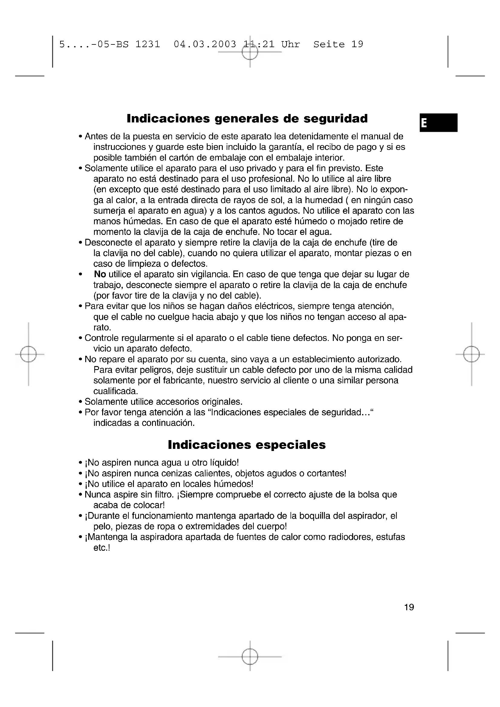 1 Cable 2 Conectador / desconectador 3 Regulador de poder de aspiración 4 Asa de transporte 5 Tecla para el enrollamiento de cable 6 Compartimiento para el accesorio 7 Abridor compartimiento para el acce- sorio 8 Indicador del llenado de la bolsa de aspirador 9 Compartimiento para la bolsa de aspirador 10 Tecla para abrir el compartimiento de la bolsa de llenado de polvo 11 Conexión de la manguera 12 Manguera aspirante 13 Tubo de aspiración telescópico 14 Tecla tubo de aspiración telescópico 15 Gancho en el tubo de aspiración 16 Boquilla para el suelo 17 Ayuda para estacionar el aspirador de suelo Accesorio: Tobera para juntas Tobera combinada de cepillo / para tapicería 5....-05-BS 1231 04.03.2003 11:21 Uhr Seite 20Tobera combinada de cepillo / para tapicería: Tenga en cuenta que la tobera de cepillo / para tapicería es una pieza sobrepuesta “2 en 1”. Para la tapicería utilice por favor la tobera sin la pieza sobrepuesta. La pieza sobrepuesta de cepillo se engancha en la tobera de tapicería. Soltar las piezas sobrepuestas: Separelas girando levemente. Regulador de poder de aspiración (3): Poder de aspiración bajo: Para cortinas, telas delicadas. Poder de aspiración medio: Para moquetas de terciopelo con pelo alto o suelos de textil. Poder de aspiración alto: Para moquetas robustas y suelos. Tubo de aspiración telescópico (13): Mediante el tubo flexible de aspiración puede lograr una adaptación individual a su altura de cuerpo. Desbloquee el enganche presionando la tecla (14) hacia abajo. Desplace el tubo de aspiración telescópico a la altura deseada. Para el bloqueo tire del tubo hasta que encaje mecánicamente. Dispositivo para el enrollamiento de cable: Por favor tire del cable (1) solamente hasta la marcación amarilla. Nunca tire hasta la marcación roja, ya que el enrollamiento de cable se podría estropear. Dichos daños no caen en la garantía. Enrollamiento: Presione la tecla (5) para el enrollamiento de cable y guie el cable. Mantenga el cable para evitar que se enrolle. Regulador de admisión: Abra el regulador de admisión que se encuentra en la empuñadura del tubo fle- xible, para su regulación de aire o para soltar piezas que se hayan pegado en la tobera. Indicación para el recambio de la bolsa de llenado de polvo (8): Mantenga la manguera de aspiración sin peso en el aire. En caso de que se ilumi- ne el indicador para el cambio de la bolsa de aspirador, significa que la bolsa está llena. Por favor cambie la bolsa llena por una vacía. Cambiar la bolsa de aspirador: Retire la clavija de la caja de enchufe. Abra con la tecla (10) la tapadera del com- partimiento de la bolsa de llenado (hasta que encaje). Retire el soporte de la bolsa