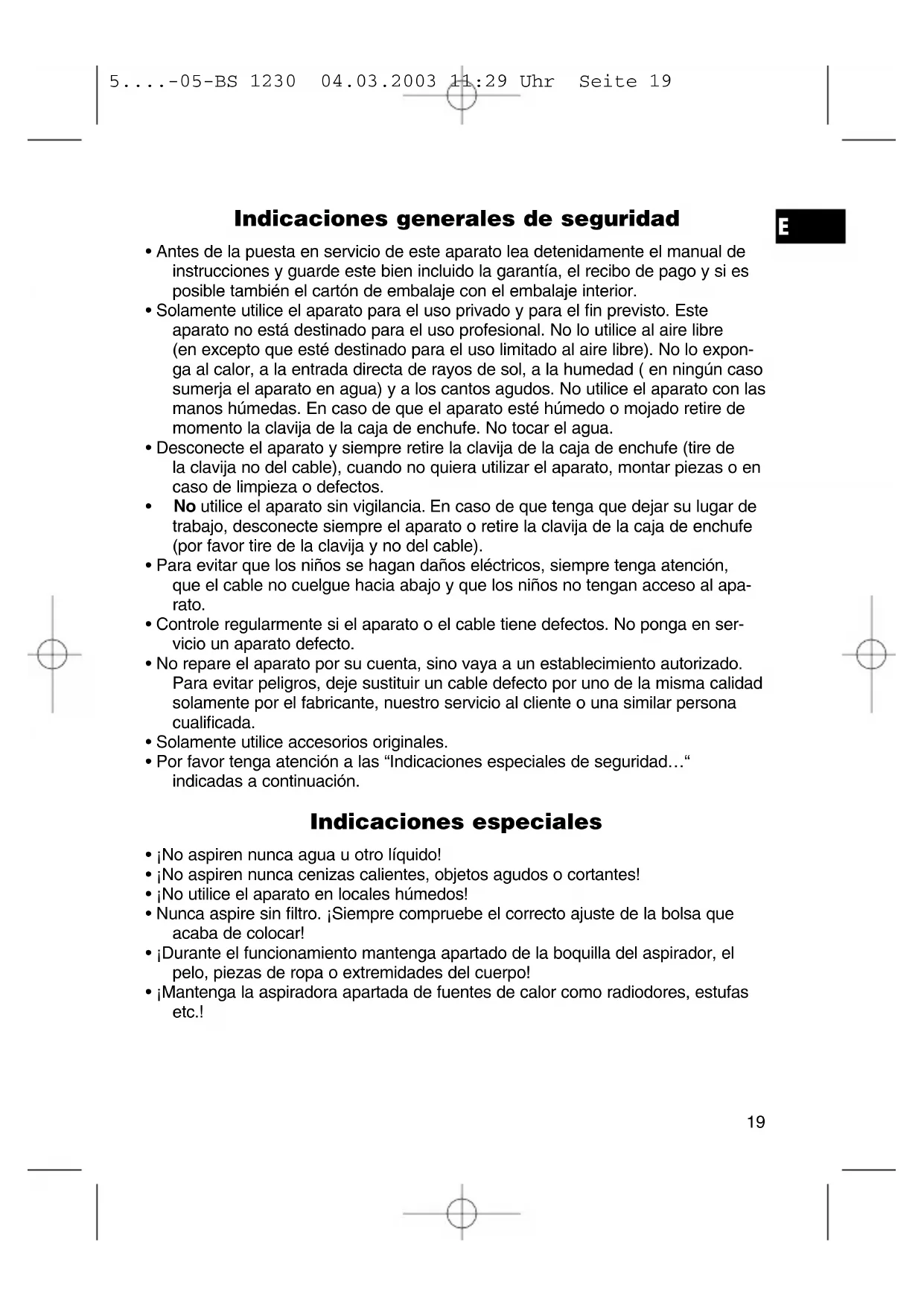 Tecla para el enrollamiento de cable 6 Indicador del llenado de la bolsa de aspirador 7 Conexión de la manguera 8 Manguera aspirante 9 Empuñadura para abrir el comparti- miento de la bolsa de llenado de polvo 10 Compartimiento para la bolsa de aspirador 11 Tubo de aspiración de dos piezas 12 Boquilla para el suelo 13 Compartimiento para el accesorio 14 Gancho en el tubo de aspiración 15 Ayuda para estacionar el aspirador de suelo, sin imagen Accesorio: Boquilla para la tapicería Tobera „2 en 1“ (Tobera para juntas y tobera de cepillo) 5....-05-BS 1230 04.03.2003 11:29 Uhr Seite 20Dispositivo para el enrollamiento de cable: Por favor tire del cable (1) solamente hasta la marcación amarilla. Nunca tire hasta la marcación roja, ya que el enrollamiento de cable se podría estropear. Dichos daños no caen en la garantía. Enrollamiento: Presione la tecla (5) para el enrollamiento de cable y guie el cable. Mantenga el cable para evitar que se enrolle. Compartimiento para el accesorio (13): El accesorio integrado (tobera para tapicería, tobera para juntas / de cepillo) lo encuentra tirando de la tapadera del compartimiento para el accesorio. Retire la tobera deseada. Boquillas: Boquilla para juntas/ Tobera de cepillo: Para la aspiración en esquinas y ranuras. Tobera "2 en 1" : Plegada (de esta forma está la tobera ubicada en el compartimento) la puede utilizar como tobera para juntas. Si quiere utilizar la tobera de cepillo, tire del cepillo en dirección de la flecha, hasta que encaje mecánicamente. Boquilla para la tapicería: Para la aspiración de tapicería, cortinas etc. Boquilla para el suelo: Para la limpieza de moquetas o superficies planas. Soltar las piezas sobrepuestas: Retire éstas girándolas levemente. Regulador de admisión: Abra el regulador de admisión que se encuentra en la empuñadura del tubo fle- xible, para su regulación de aire o para soltar piezas que se hayan pegado en la tobera. Indicación para el recambio de la bolsa de llenado de polvo (6): Mantenga la manguera de aspiración sin peso en el aire. En caso de que se ilumi- ne el indicador para el cambio de la bolsa de aspirador, significa que la bolsa está llena. Por favor cambie la bolsa llena por una vacía. Cambiar la bolsa de aspirador: Retire la clavija de red de la caja de enchufe. Abra con la tecla (9) el compartimien- to de la bolsa de llenado (10). Retire el soporte de la bolsa, apriete por favor la tecla con el muelle para poder soltar la bolsa y extraiga la bolsa de llenado de polvo del soporte. Presione de nuevo la tecla y coloque una bolsa nueva. Ajuste otra vez el soporte. Cierre la tapadera de manera que ésta encaje.