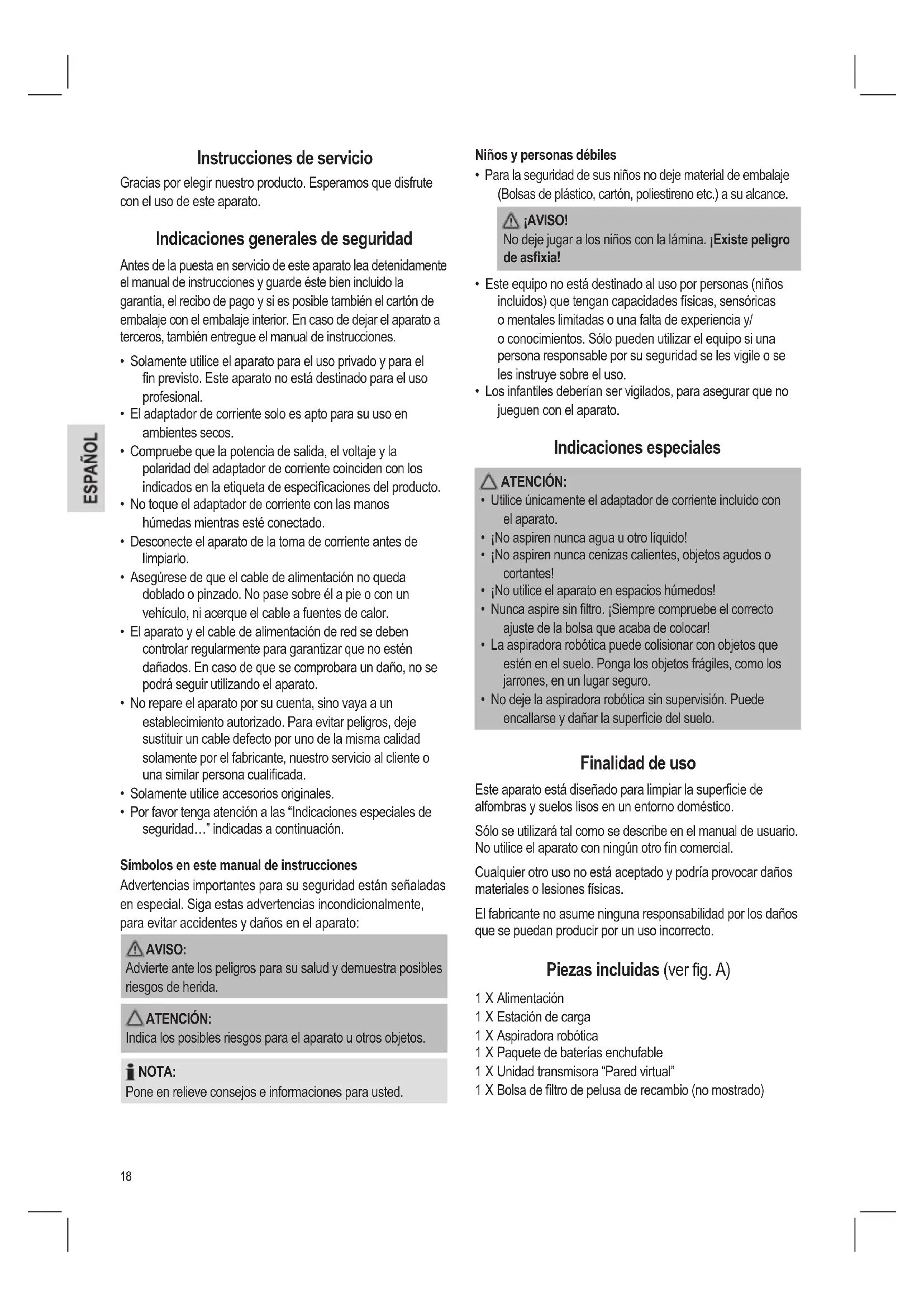 - No deje la aspiradora robótica sin supervisión. Puede encallarse y dañar la supercie del suelo. Finalidad de uso Este aparato está diseñado para limpiar la supercie de alfombras y suelos lisos en un entorno doméstico. Sólo se utilizará tal como se describe en el manual de usuario. No utilice el aparato con ningún otro n comercial. Cualquier otro uso no está aceptado y podría provocar daños materiales o lesiones físicas. El fabricante no asume ninguna responsabilidad por los daños que se puedan producir por un uso incorrecto. Piezas incluidas (ver g. A) 1 X Alimentación 1 X Estación de carga 1 X Aspiradora robótica 1 X Paquete de baterías enchufable 1 X Unidad transmisora “Pared virtual” 1 X Bolsa de ltro de pelusa de recambio (no mostrado)19 Desembalaje del aparato