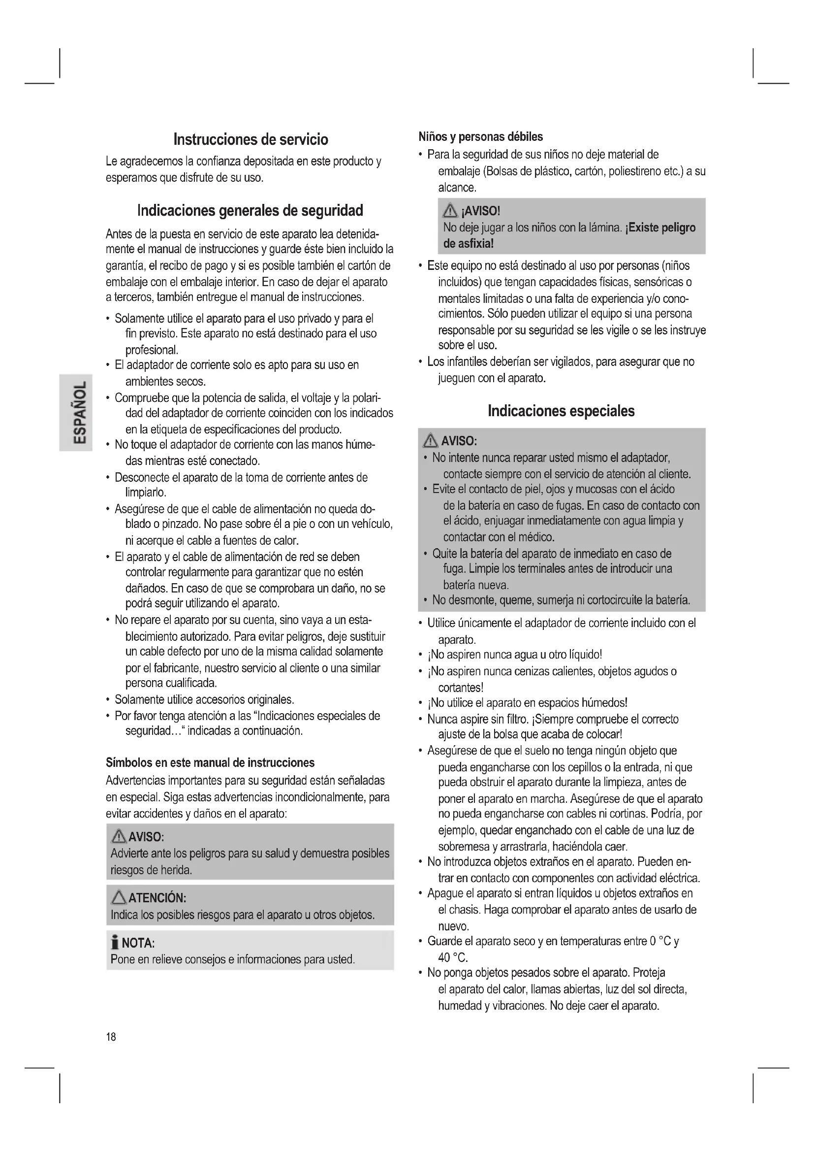 - Por favor tenga atención a las “Indicaciones especiales de seguridad…“ indicadas a continuación. Símbolos en este manual de instrucciones Advertencias importantes para su seguridad están señaladas en especial. Siga estas advertencias incondicionalmente, para evitar accidentes y daños en el aparato: AVISO: Advierte ante los peligros para su salud y demuestra posibles riesgos de herida. ATENCIÓN: Indica los posibles riesgos para el aparato u otros objetos. NOTA: Pone en relieve consejos e informaciones para usted. Niños y personas débiles