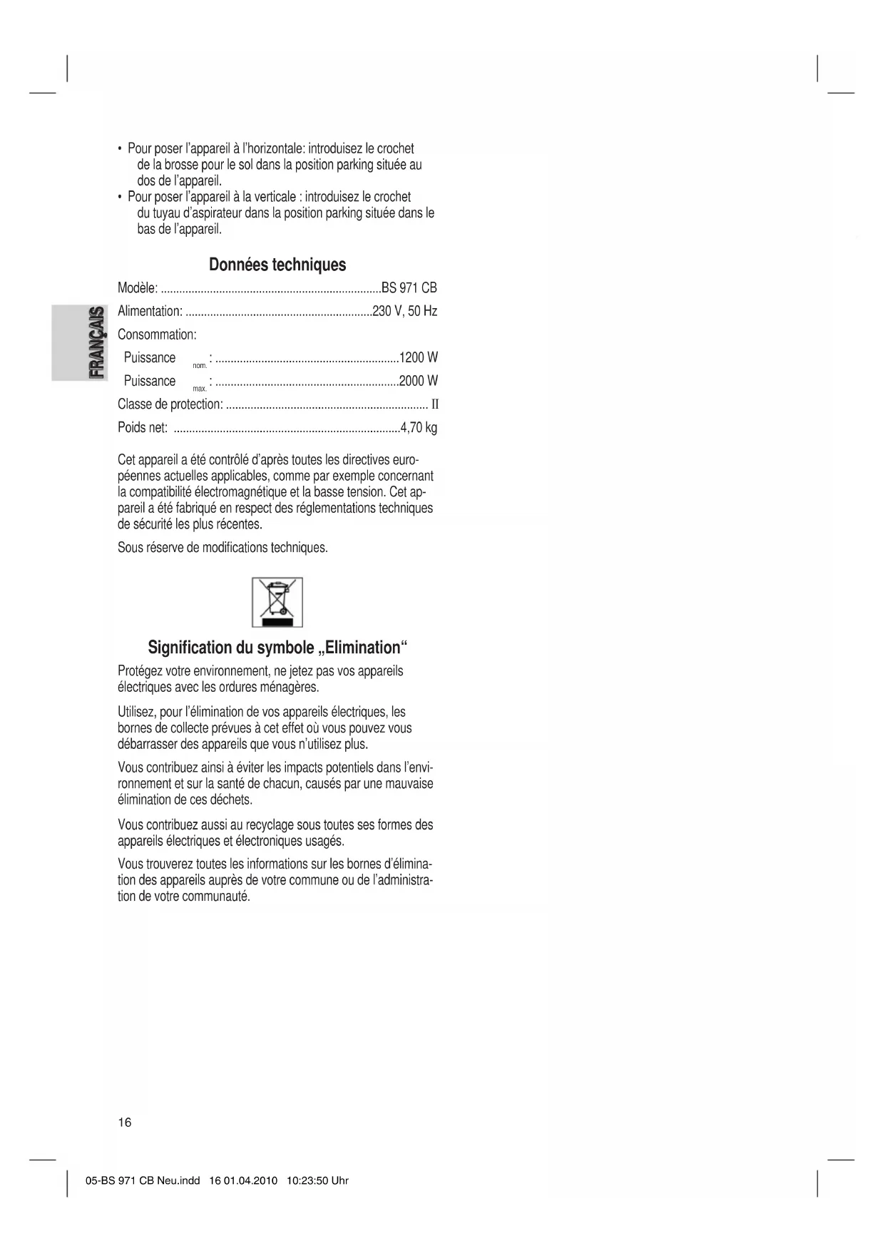- Si coloca el aparato de forma vertical: Cuelgue por favor el gancho del tubo de aspiración en la ayuda de estaciona- miento que se encuentra en la cara inferior del aparato. Datos técnicos Modelo: ........................................................................BS 971 CB Suministro de tensión:...............................................230 V, 50 Hz Consumo de energía: