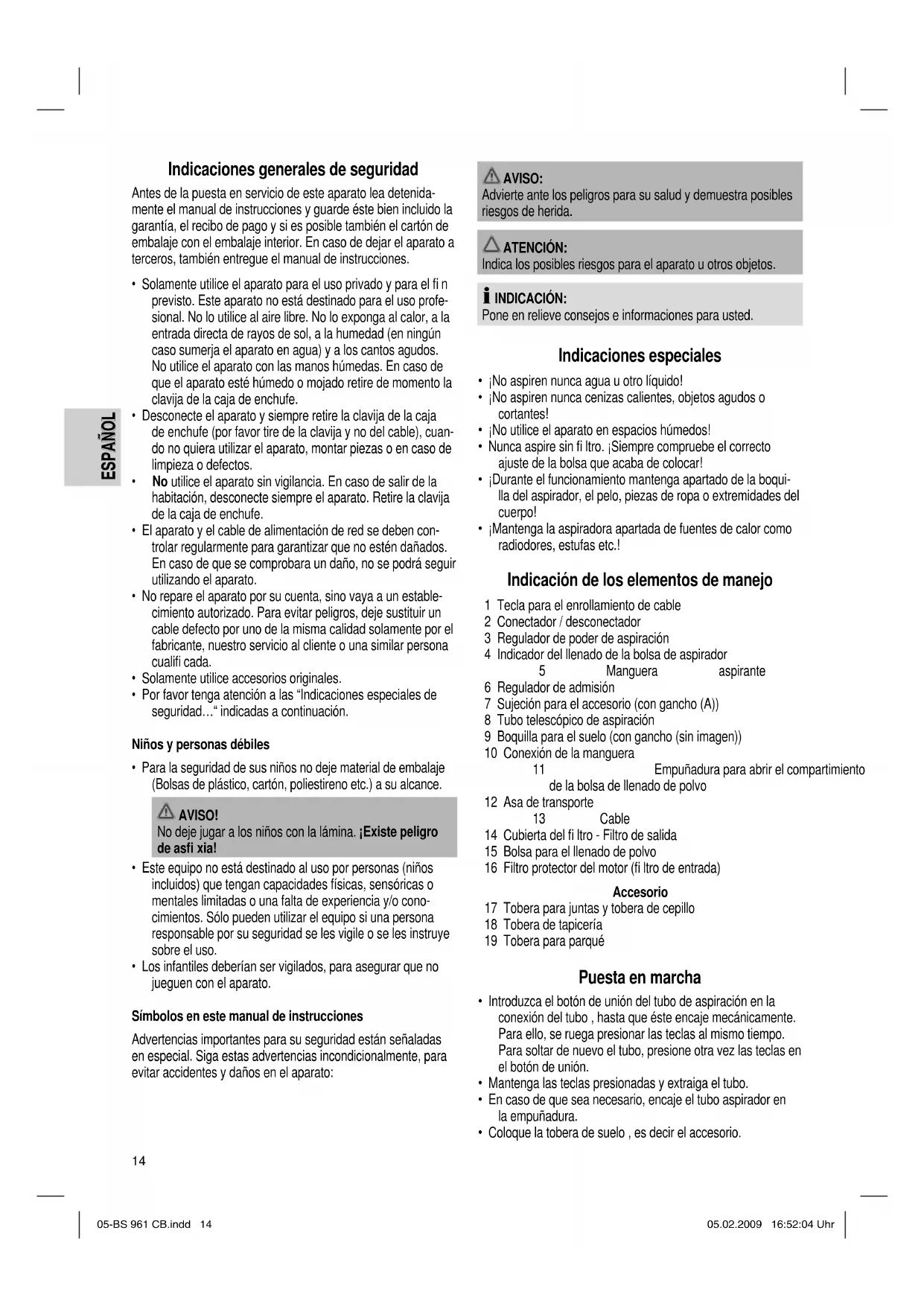 - Coloque una nueva bolsa, tenga atención que la bolsa esté bien colocado en la guía. Recoloque el dispositivo fi jador. Cierre la tapadera de manera que encaje. Filtro Su aparato dispone de dos fi ltros. Filtro protector del motor (fi ltro de entrada) (16) El fi ltro de entrada se encuentra en el compartimiento de la bolsa de aspirador. El fi ltro está ubicado de forma vertical en la parte posterior de la caja de polvo. Extraiga el fi ltro hacia arriba. 05-BS 961 CB.indd 1505-BS 961 CB.indd 15 05.02.2009 16:52:04 Uhr05.02.2009 16:52:04 Uhr16 ESPAÑOL ESPAÑOL Limpieza del elemento fi ltrante Limpie el fi ltro protector del motor al cabo de cada décimo cambio de la bolsa de aspirador. En caso de que sea necesario, puede lavar el fi ltro en agua caliente, sin aditivos. ¡Solamente coloque de nuevo el fi ltro, cuando está seco por completo! Filtro de salida Su aparato también dispone de un fi ltro de salida. Encontrará este fi ltro bajo la cubierta del fi ltro (14).