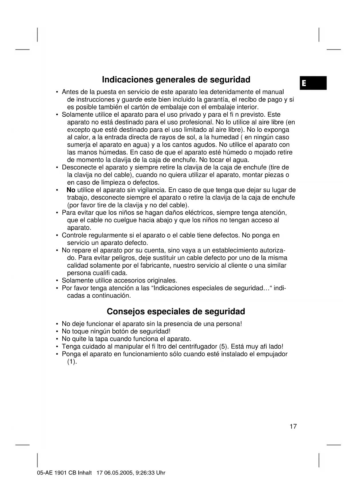 - Ponga el aparato en funcionamiento sólo cuando esté instalado el empujador (1). 05-AE 1901 CB Inhalt 17 06.05.2005, 9:26:33 UhrE