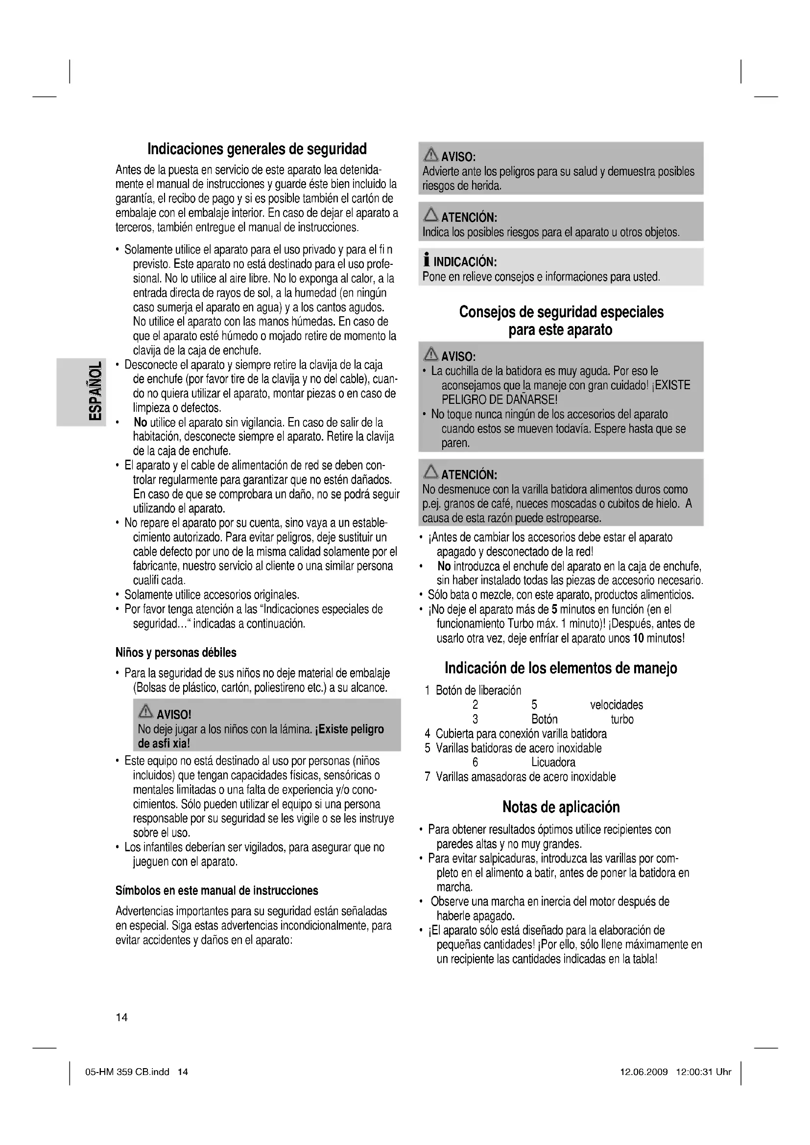 - ¡El aparato sólo está diseñado para la elaboración de pequeñas cantidades! ¡Por ello, sólo llene máximamente en un recipiente las cantidades indicadas en la tabla! 05-HM 359 CB.indd 1405-HM 359 CB.indd 14 12.06.2009 12:00:31 Uhr12.06.2009 12:00:31 Uhr15 ESPAÑOL ESPAÑOL Varilla batidora rápida (6) Desmenuce los trozos grandes de alimentos sólidos antes de triturarlos (máx. Ø 1,5 cm) y añada un poco de líquido. Funcionamiento turbo (3) Para una utilización corta a alta velocidad. Apriete la tecla por intermitencias para obtener un funcionamiento Pulso. ATENCIÓN: ¡Por favor utilice esta función solamente hasta 1 minuto! Puesta en marcha Preparación