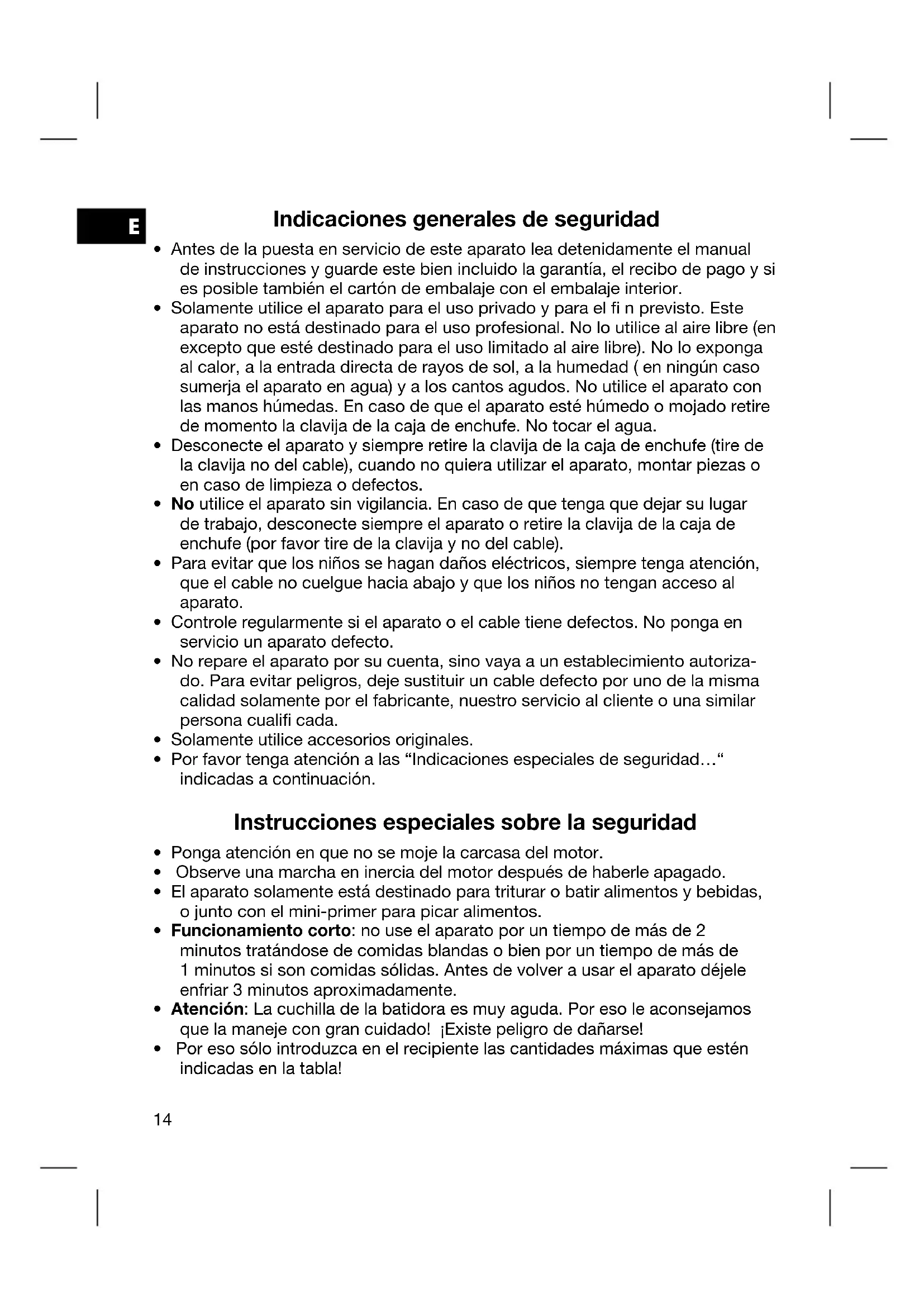 - Por favor tenga atención a las “Indicaciones especiales de seguridad…“ indicadas a continuación. Instrucciones especiales sobre la seguridad