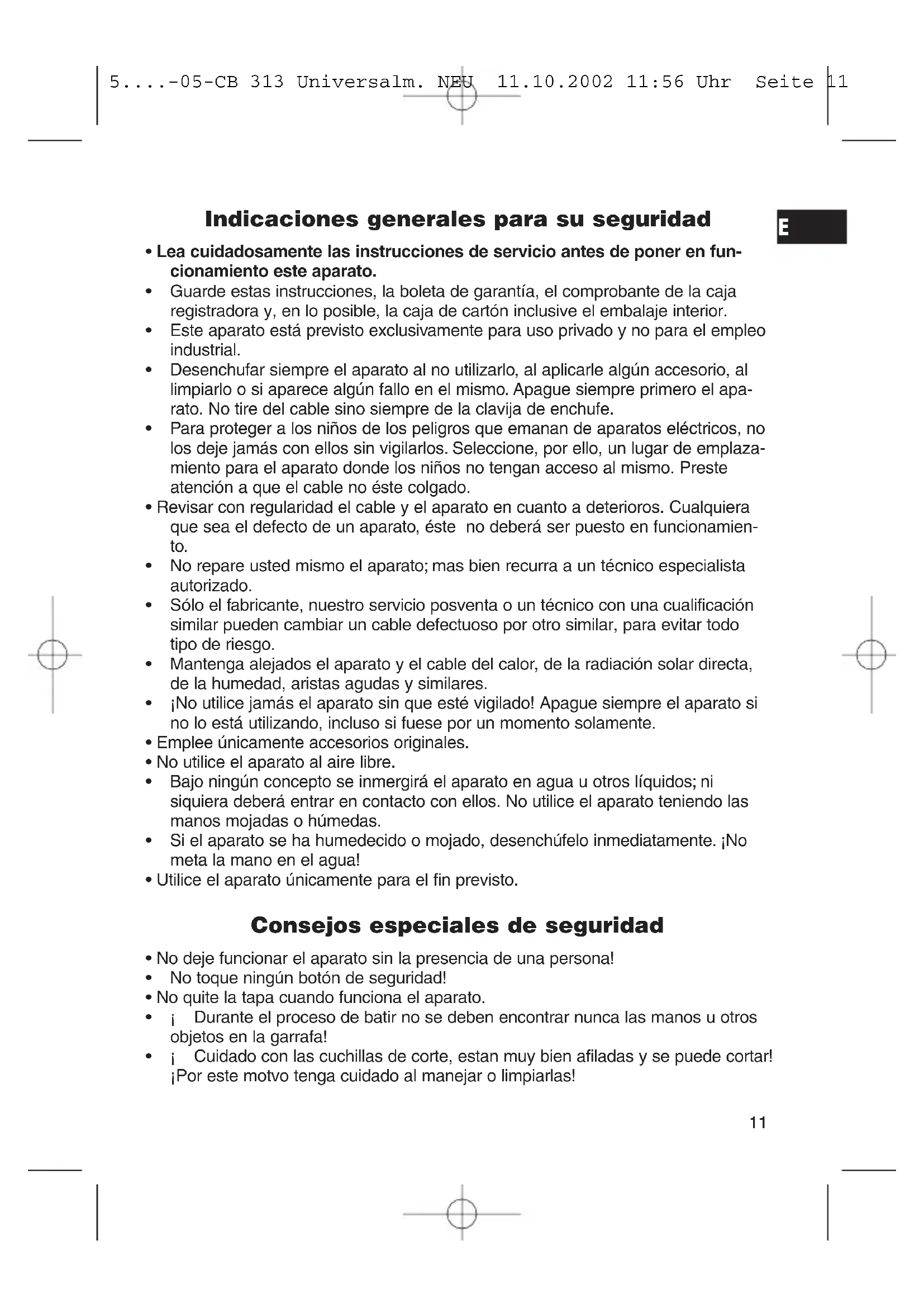 5....-05-CB 313 Universalm. NEU 11.10.2002 11:56 Uhr Seite 12Este aparato responde a las directivas de CE para la supresión de interferencias y la seguridad de baja tensión y ha sido construido según las últimas prescripciones de seguridad técnica. No reservamos el derecho de efectuar modificaciones técnicas. Garantía Este producto está garantizado por nosotros durante 24 meses a partir de la fecha de adquisición (factura de compra). En el tiempo de garantía nos hacemos cargo de eliminar gratuitamente mediante reparación o cambio todos los defectos del aparato debidos a una imperfecta fabri- cación o a los materiales. La garantía tendrá validez con la factura de compra. Si no dispone de la factura no se podrá realizar el cambio o la reparación de forma gratuita. En caso de garantía debe llevar el producto completo con el embalaje original y la factura de compra a su establecimiento de adquisición. En caso de rotura de cristal y defectos en los accesorios no se cambia el aparato, sino se recambian los accesorios en envío gratuito. ¡En este caso no envíe todo el aparato, sino encargue solamente la pieza defecta! La limpieza, el mantenimiento o el cambio de piezas que se desgastan no entran en la garantía y deben ser abonados por usted. La garantía no tendrá validez si el defecto es ocasionado por tercera personas. Después de la garantía Cuando se haya expirado la garantía las reparaciones se realizan por el comercio especializado o el servicio al cliente y serán abonados por usted.