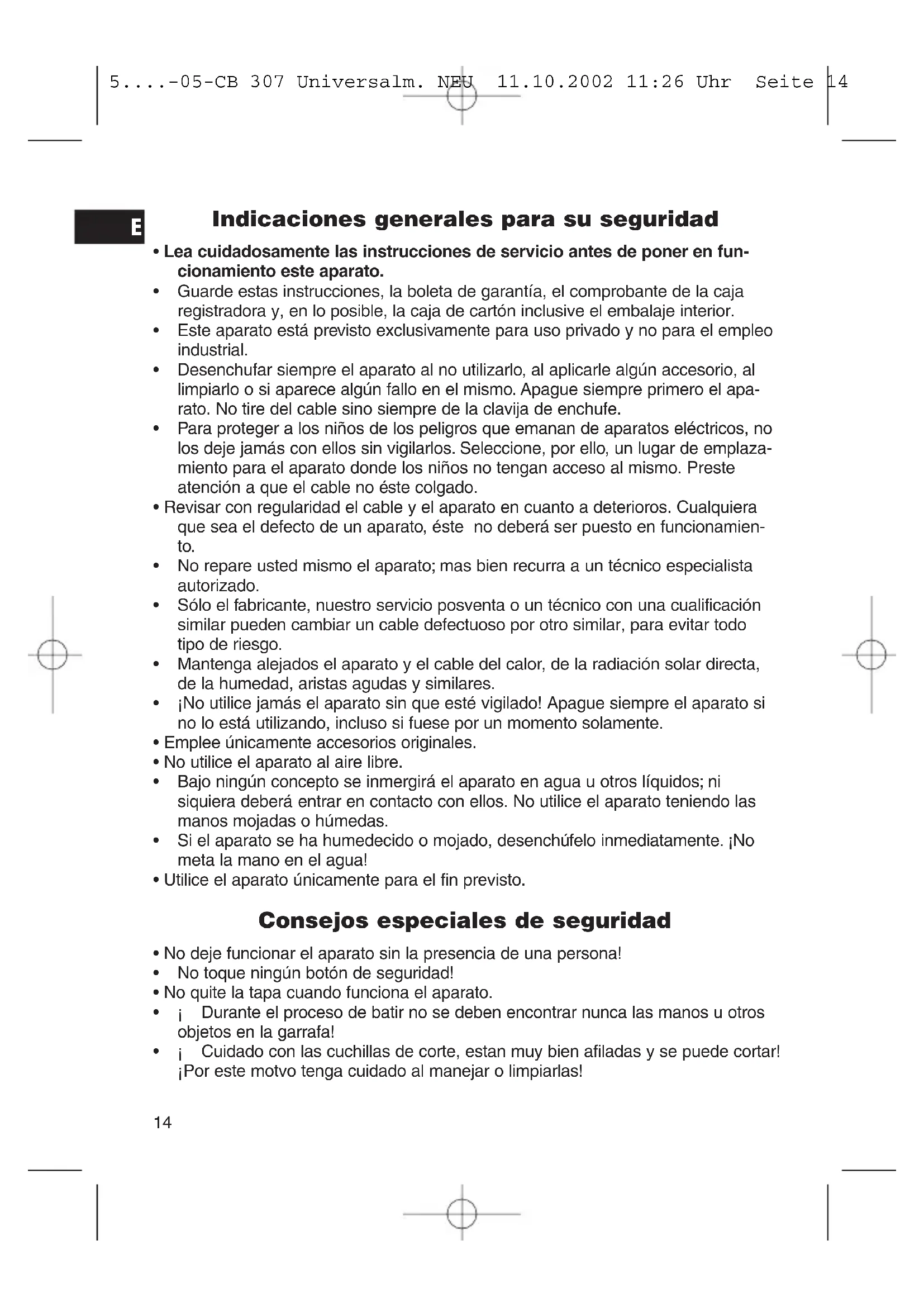 5....-05-CB 307 Universalm. NEU 11.10.2002 11:26 Uhr Seite 15Limpieza Después de cada uso desmonte el batidor. Lave y seque todas las piezas de la garrafa. Atención: ¡Antes de desmontar el batidor debe desconectar el enchufe de la red! Las piezas de la garrafa se pueden colocar para el lavado en el bastidor superior del lavavajillas. Después del lavado y del secado se tiene que montar la garrafa de tal manera, que el anillo junta se encuentre entre la cuchilla y la garrafa. Véa „Indicación de los elementos de manejo“. Antes de cada uso se debe entornillar firmemente y seguro la cuchilla en la garrafa. Limpie la parte exterior de la base del batidor con un paño húmedo. Indicación importante para el interruptor de seguridad El batidor universal está equipado con un interruptor de seguridad para evitar que el motor se active sin que esté montado el recipiente (¡Peligro de daños!). Colocando el recipiente, el mandril de seguridad en el disco protector transparente presiona sobre el interruptor de seguridad de la carcasa de motor. Ahora se puede conectar el batidor universal. En caso de que el mandril de seguridad no presione bien el interruptor de seguridad, el motor no se activára. Esto puede ocurrir cuando se haya cambiado al limpiar la posición del anillo junta transparente. Por este motivo tenga atención que el mandril de seguridad se encuentre en la posición correcta. Para personas que usan la mano derecha debería estar el mandril de seguridad aproximadamente bajo la empuñadura. Para zurdos debería estar el mandril de seguridad aproximadamente bajo el pico. Este aparato responde a las directivas de CE para la supresión de interferencias y la seguridad de baja tensión y ha sido construido según las últimas prescripciones de seguridad técnica. No reservamos el derecho de efectuar modificaciones técnicas. Garantía Este producto está garantizado por nosotros durante 24 meses a partir de la fecha de adquisición (factura de compra). En el tiempo de garantía nos hacemos cargo de eliminar gratuitamente mediante reparación o cambio todos los defectos del aparato debidos a una imperfecta fabri- cación o a los materiales.