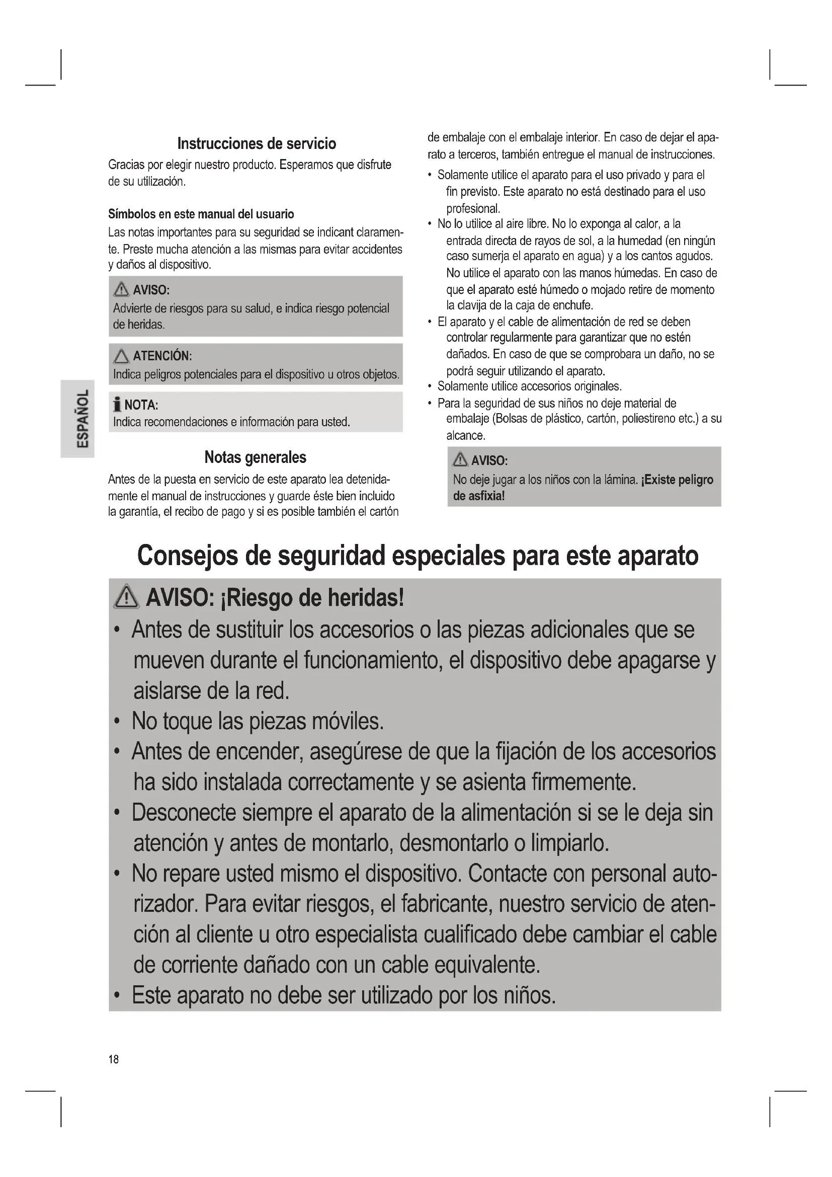 - Para la seguridad de sus niños no deje material de embalaje (Bolsas de plástico, cartón, poliestireno etc.) a su alcance. AVISO: No deje jugar a los niños con la lámina. ¡Existe peligro de asxia! Consejos de seguridad especiales para este aparato AVISO: ¡Riesgo de heridas!