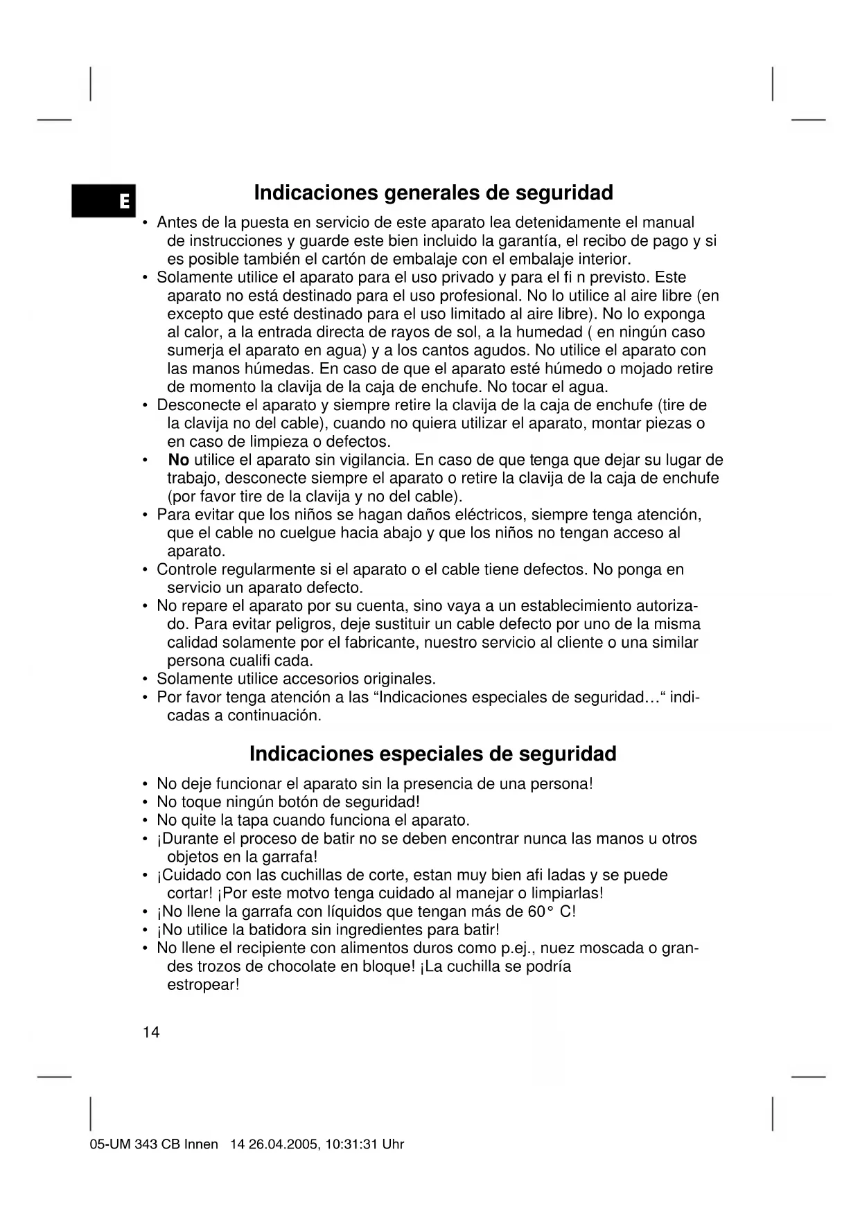 - No llene el recipiente con alimentos duros como p.ej., nuez moscada o gran- des trozos de chocolate en bloque! ¡La cuchilla se podría estropear! 05-UM 343 CB Innen 14 26.04.2005, 10:31:31 UhrE
