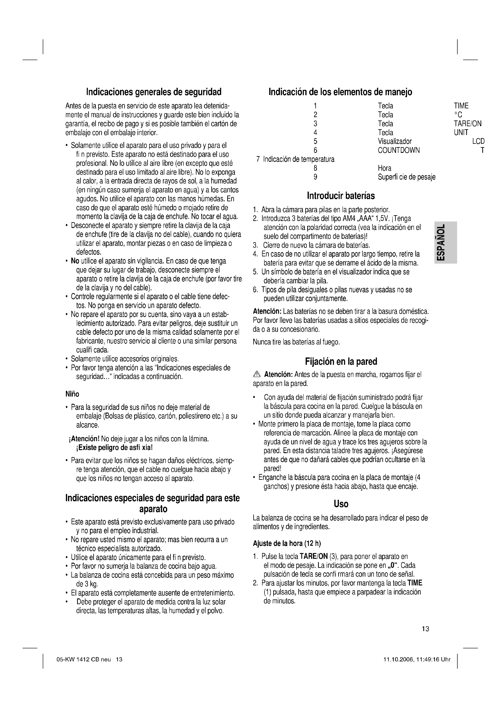 (1) pulsada, hasta que empiece a parpadear la indicación de minutos. 05-KW 1412 CB neu 13 11.10.2006, 11:49:16 Uhr14 ESPAÑOL ESPAÑOL