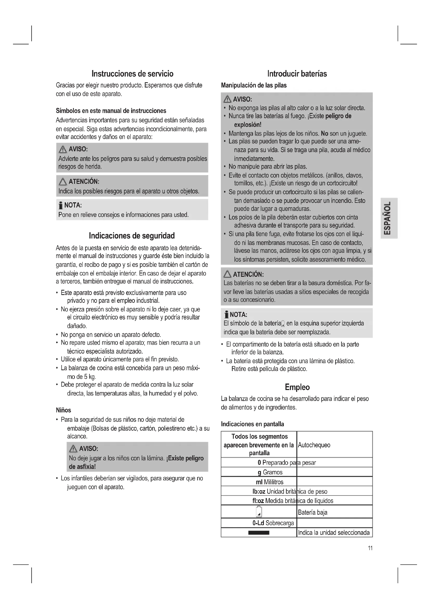 - La batería está protegida con una lámina de plástico. Retire está película de plástico. Empleo La balanza de cocina se ha desarrollado para indicar el peso de alimentos y de ingredientes. Indicaciones en pantalla Todos los segmentos aparecen brevemente en la pantalla Autochequeo 0 Preparado para pesar g Gramos ml Mililitros lb:oz Unidad británica de peso :oz Medida británica de líquidos Batería baja 0-Ld Sobrecarga Indica la unidad seleccionada12 La conexión
