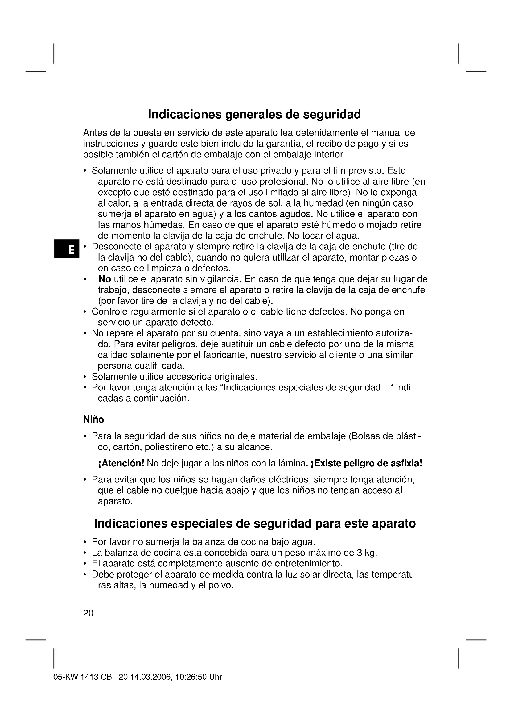- Después de la limpieza seque bien el aparato con un paño seco. Datos técnicos Modelo: .................................................................................................KW 1413 CB Suministro de tensión:................................................................. DC 3 V (CR 3032) Máx. Carga de peso: ..........................................................................................3 kg Este aparato se ha examinado según las normativas actuales y vigentes de la Comunidad Europea, como p.ej. compatibilidad electromagnética y directiva de baja tensión y se ha construido según las más nuevas especifi caciones en razón de la seguridad. No reservamos el derecho de efectuar modifi caciones técnicas. 05-KW 1413 CB 23 14.03.2006, 10:26:54 UhrE