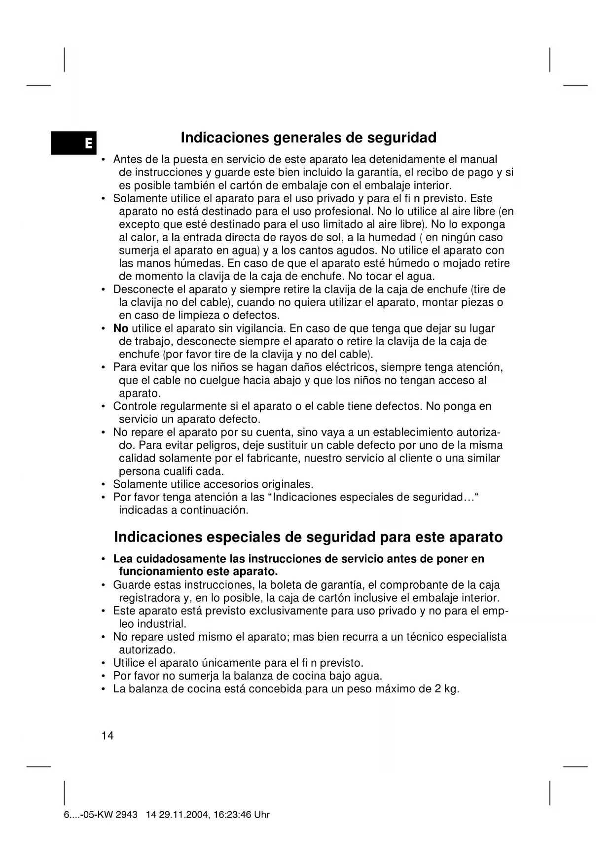 - La balanza de cocina está concebida para un peso máximo de 2 kg. 6....-05-KW 2943 14 29.11.2004, 16:23:46 UhrE