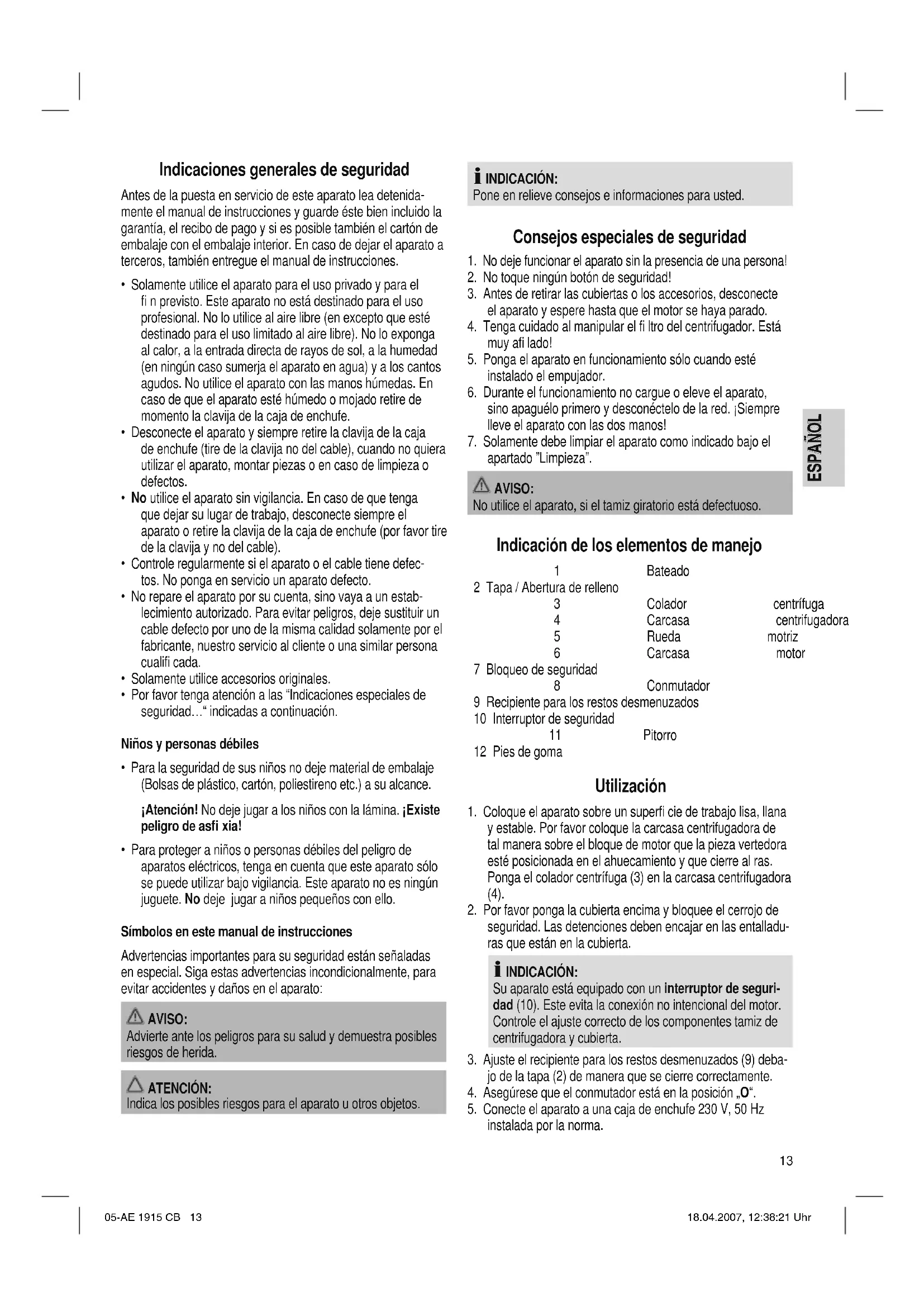 - El aparato no tiene función Remedio: Supervise la conexión a la red. Supervise la posición del interruptor. Otras posibles causas: Su aparato está equipado con un interruptor de seguridad (10). Este evita la conexión no intencional del motor. Remedio: Controle el ajuste correcto de los componentes tamiz de centrifugadora y cubierta. Datos técnicos Modelo: ...................................................................... AE 1915 CB Suministro de tensión: ..................................220-240 V, 50/60 Hz Consumo de energía: ..................................................500-700 W Clase de protección: ................................................................... ΙΙ Intervalo de corto funcionamiento:.......................................3 Min. Este aparato se ha examinado según las normativas actuales y vigentes de la Comunidad Europea, como p.ej. compati- bilidad electromagnética y directiva de baja tensión y se ha construido según las más nuevas especifi caciones en razón de la seguridad. No reservamos el derecho de efectuar modifi caciones técnicas. 05-AE 1915 CB 14 18.04.2007, 12:38:23 UhrESPAÑOL