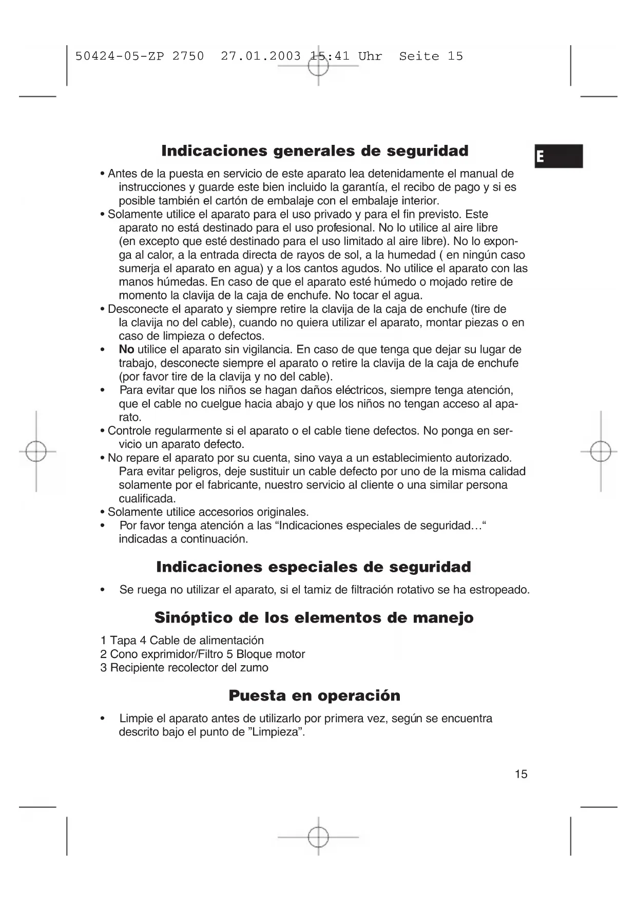 - Se ruega no utilizar el aparato, si el tamiz de filtración rotativo se ha estropeado. Sinóptico de los elementos de manejo 1 Tapa 4 Cable de alimentación 2 Cono exprimidor/Filtro 5 Bloque motor 3 Recipiente recolector del zumo Puesta en operación